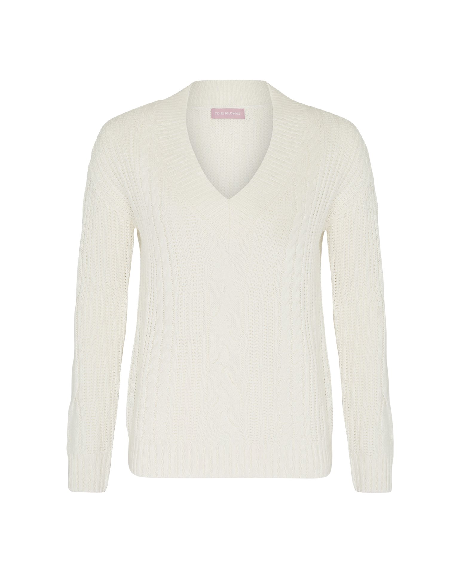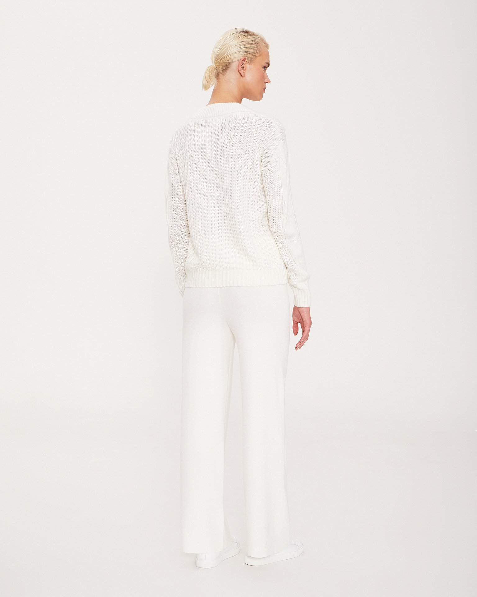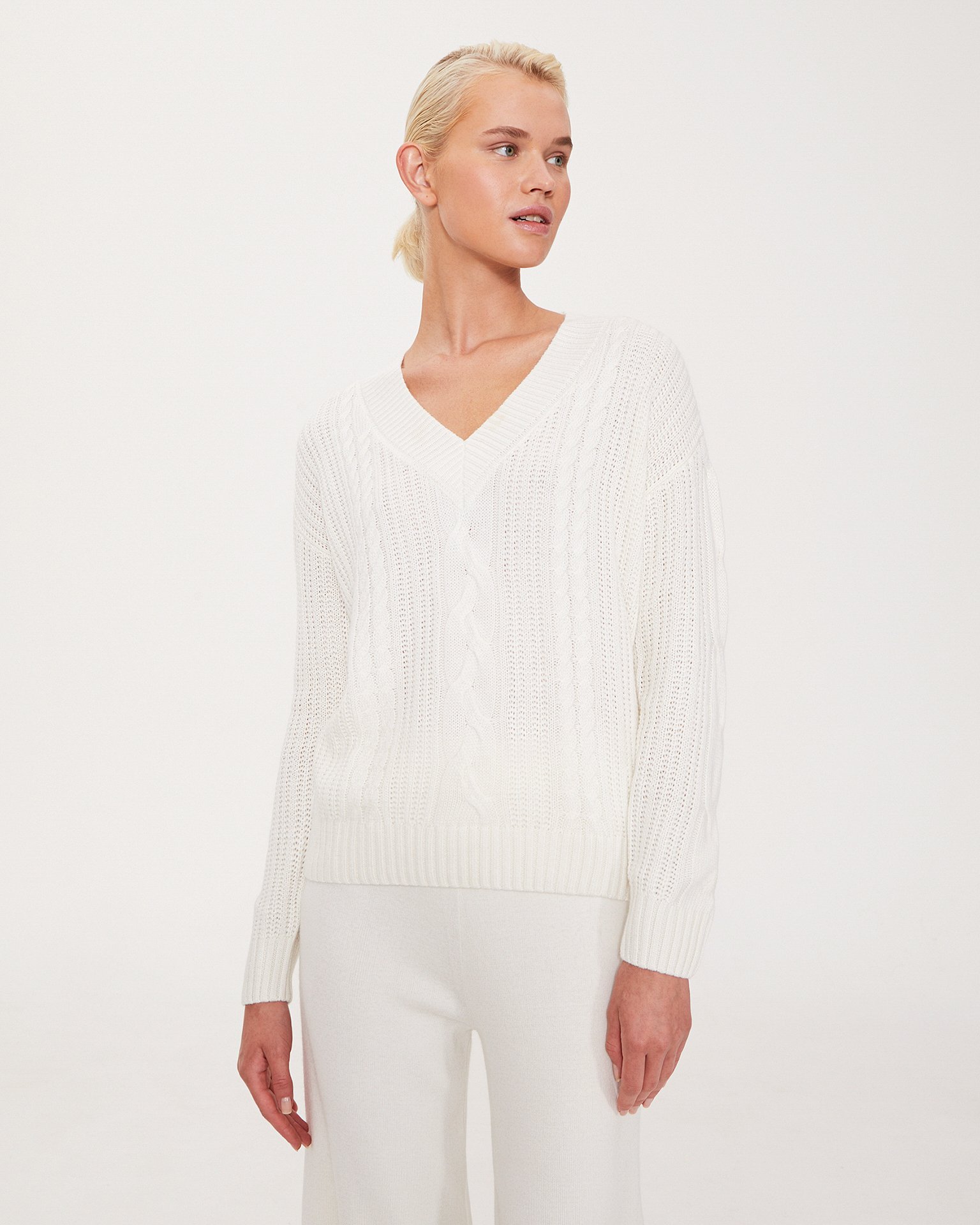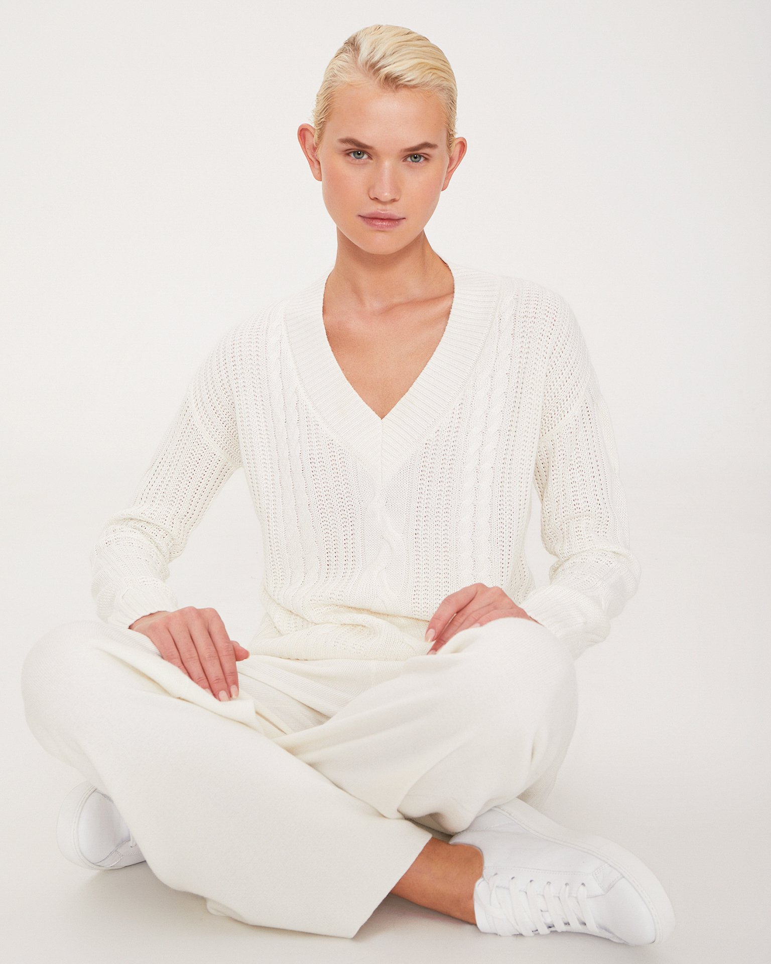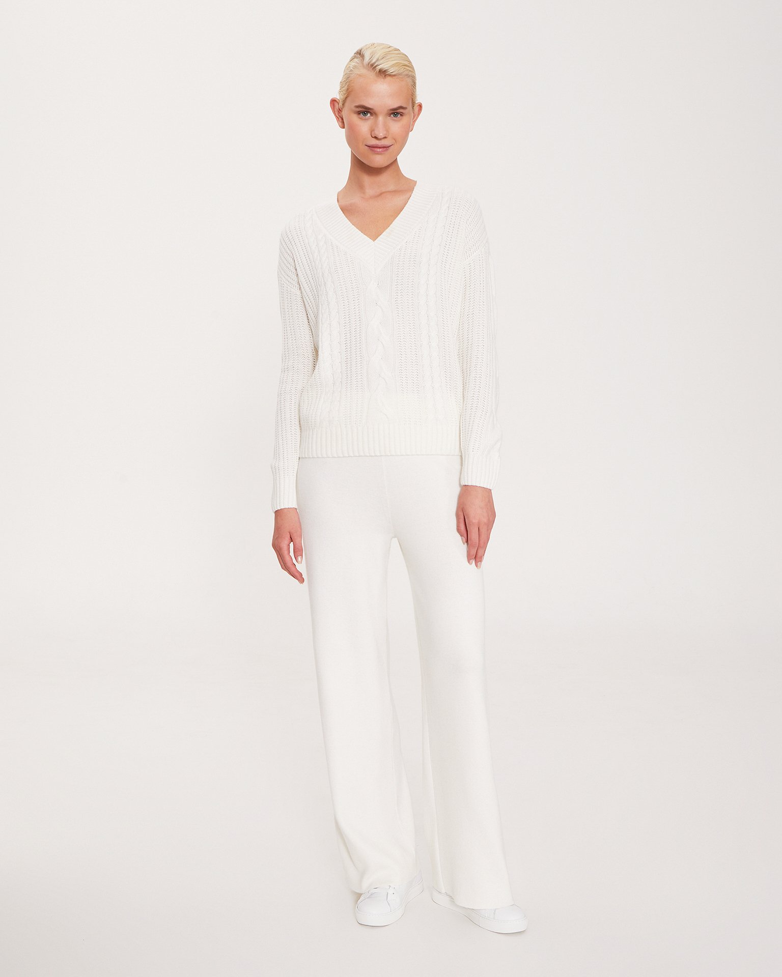 Джемпер свободной посадки и лаконичным V-образным вырезом. Нижний край свитера и рукавов связаны резинкой, перед и спинка — узором с косами. Брюки прямые, расклешенные от бедра.