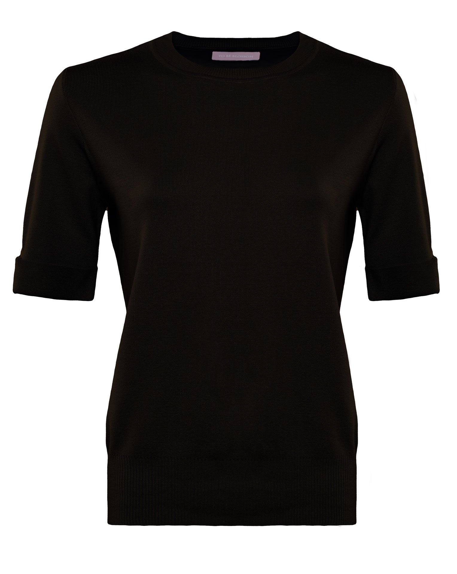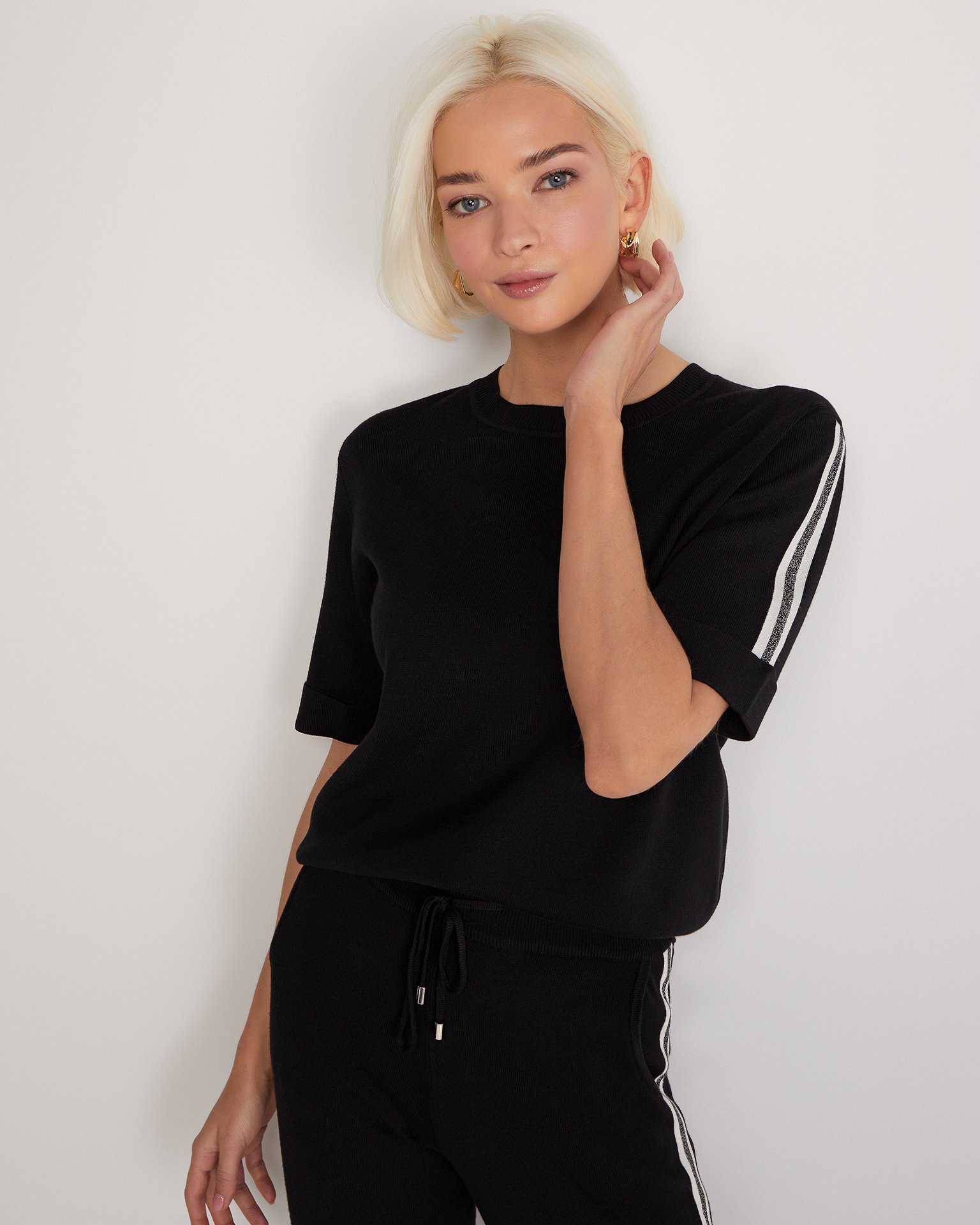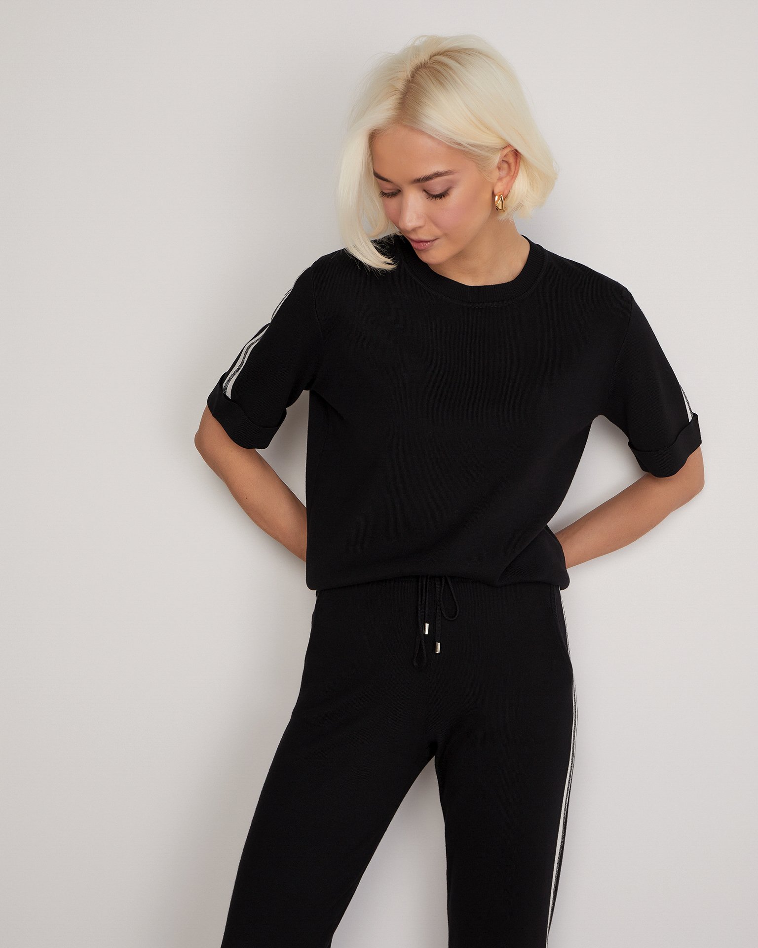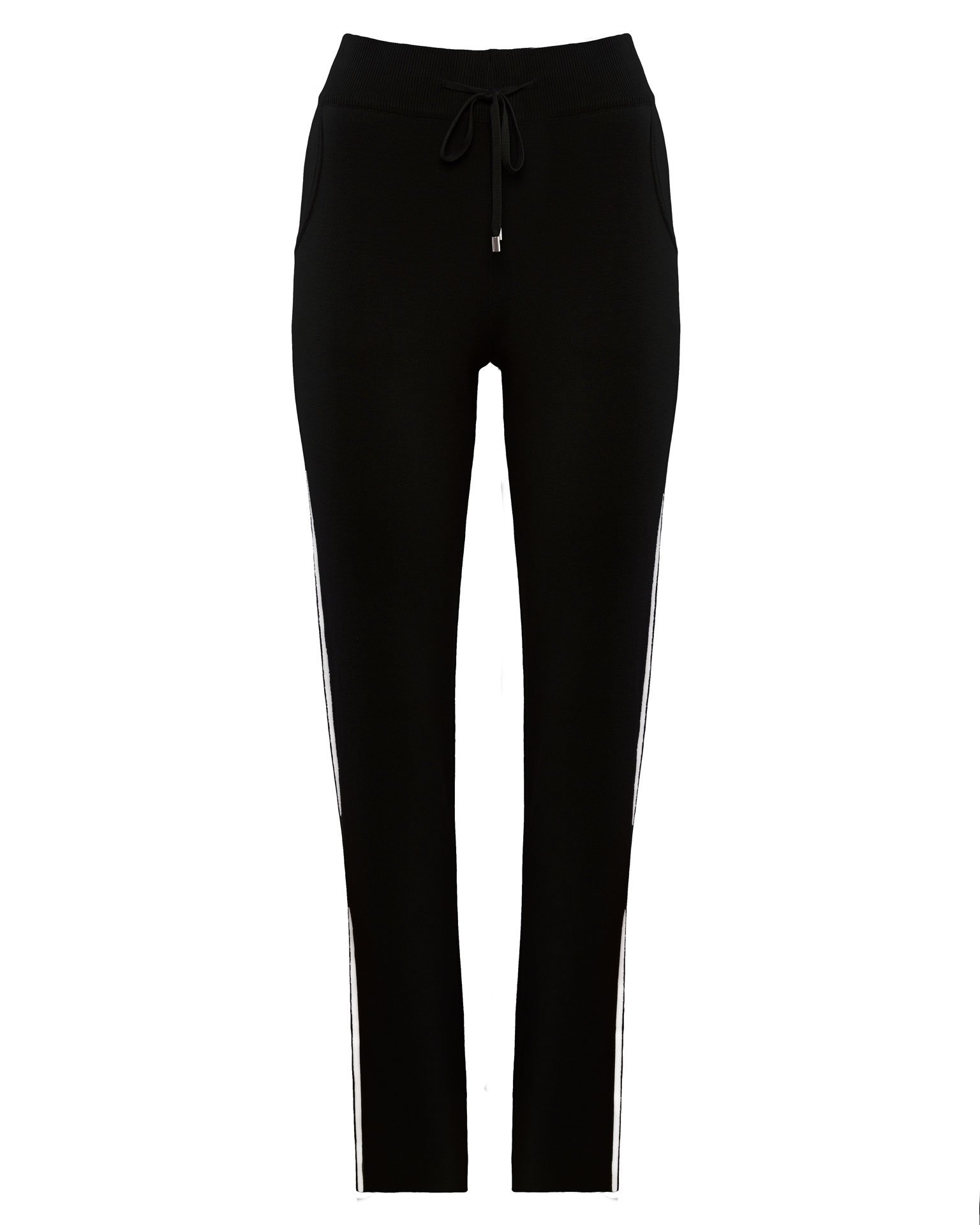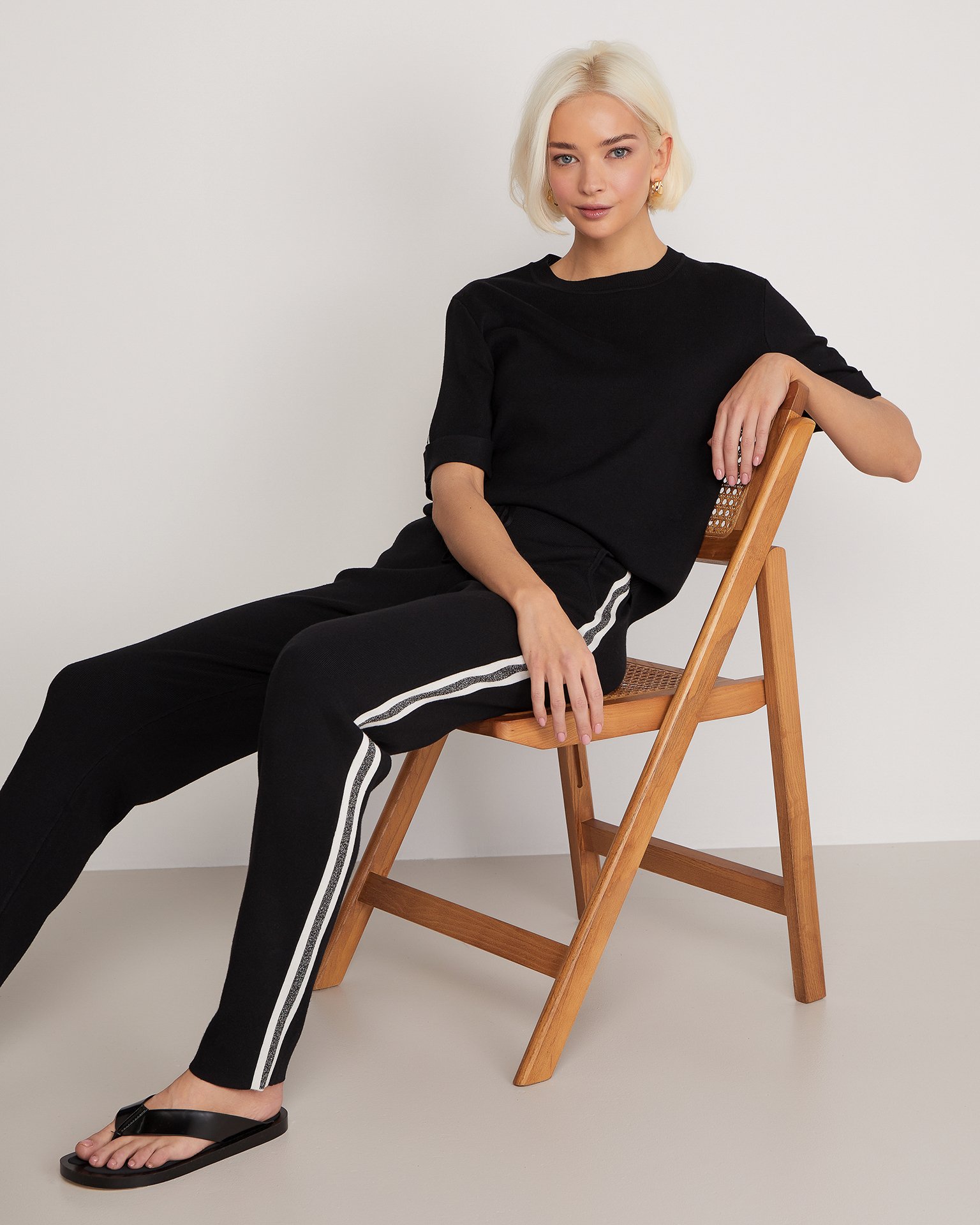 Джемпер прямого кроя, аккуратный круглый вырез, обработанный резинкой, втачные рукава с подворотами. Брюки на эластичном поясе дополнены двумя прорезными карманами по бокам. Модель с лампасами из мерцающей ткани.