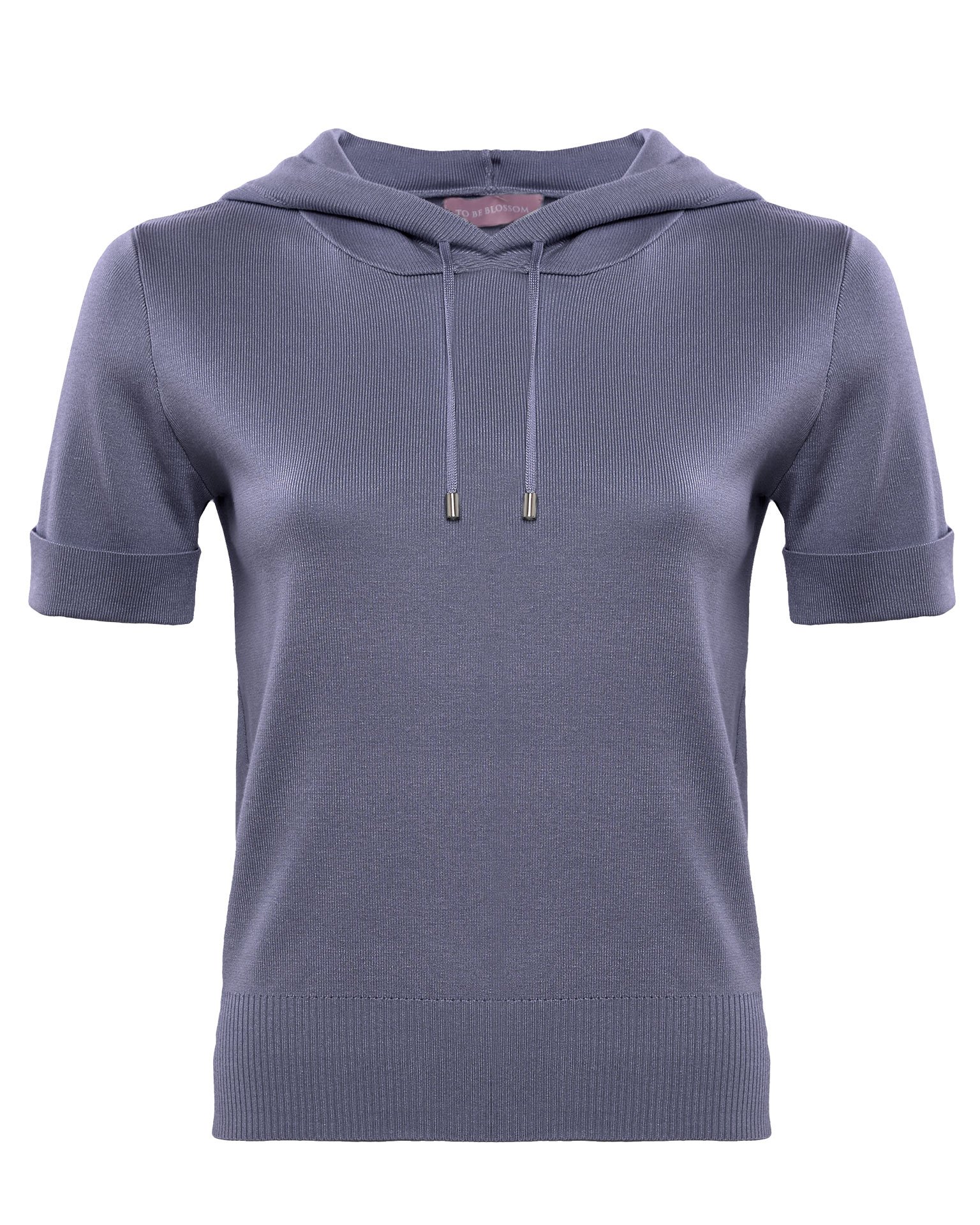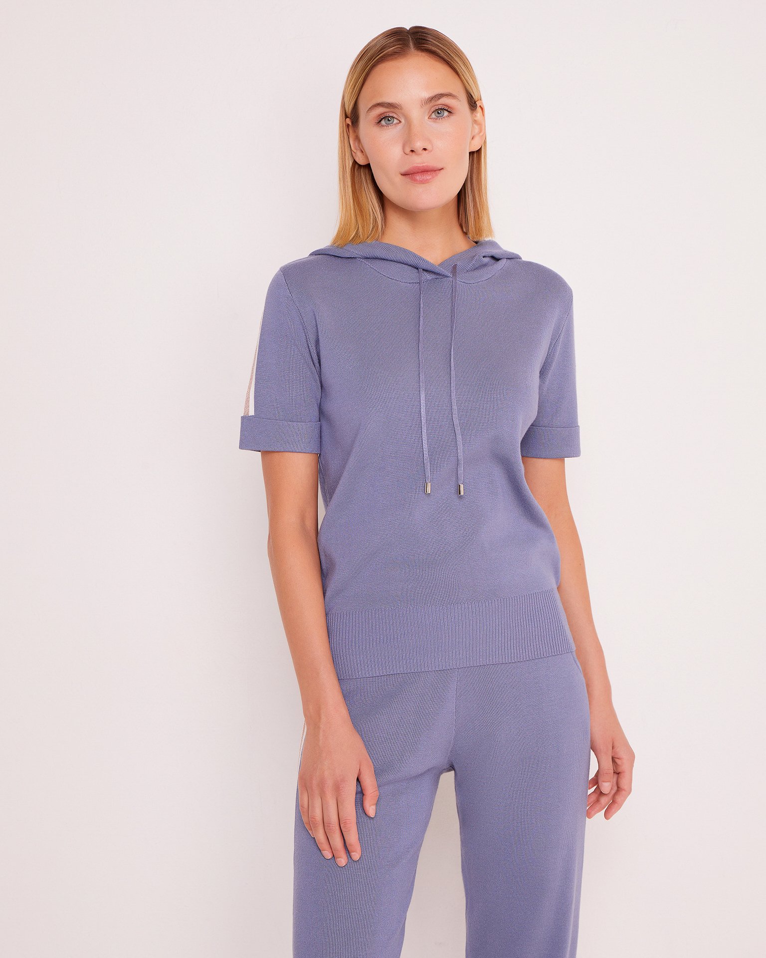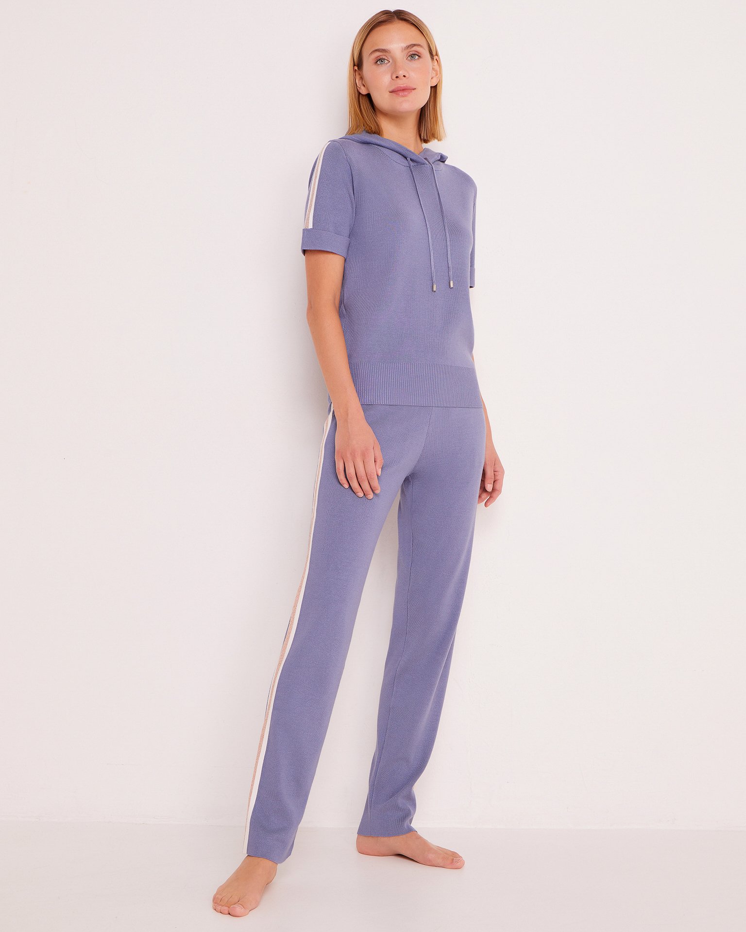 Комплект из вискозы. Джемпер с короткими рукавами с отворотами и лампасами, капюшоном на шнурках, резинкой по нижнему краю. Свободные прямые брюки на резинке, с лампасами как на рукавах джемпера. Легкий костюм в стиле спорт шик из натурального материала - незаменимый элемент в весенне-летнем гардеробе. Носите его с простыми белыми кедами или кроссовками. Брюки можно сочетать с однотонными футболками, а джемпер с теннисными шортами или бермудами. Параметры модели: Рост 172 см, грудь 80 см, талия 59 см, бедра 89 см.