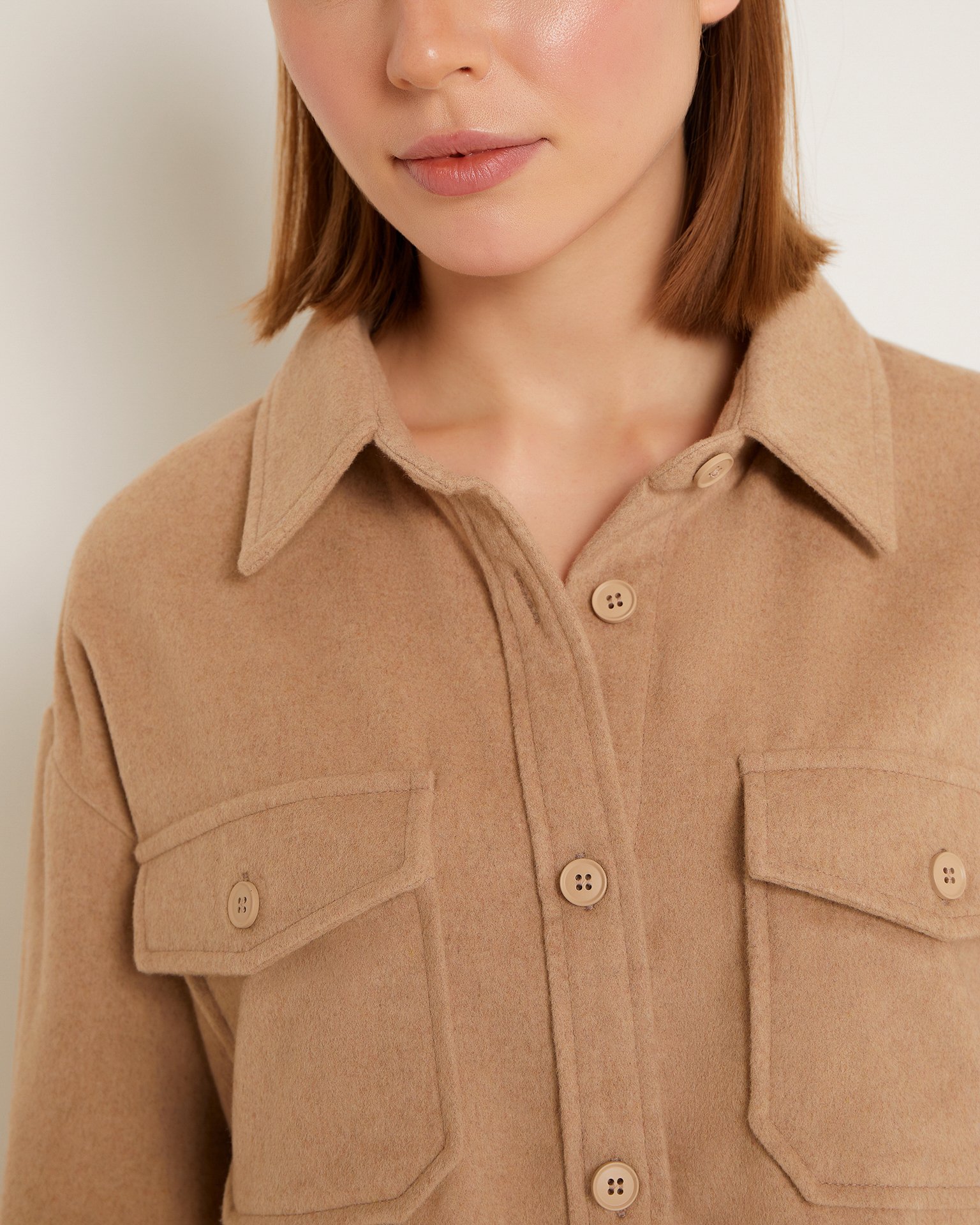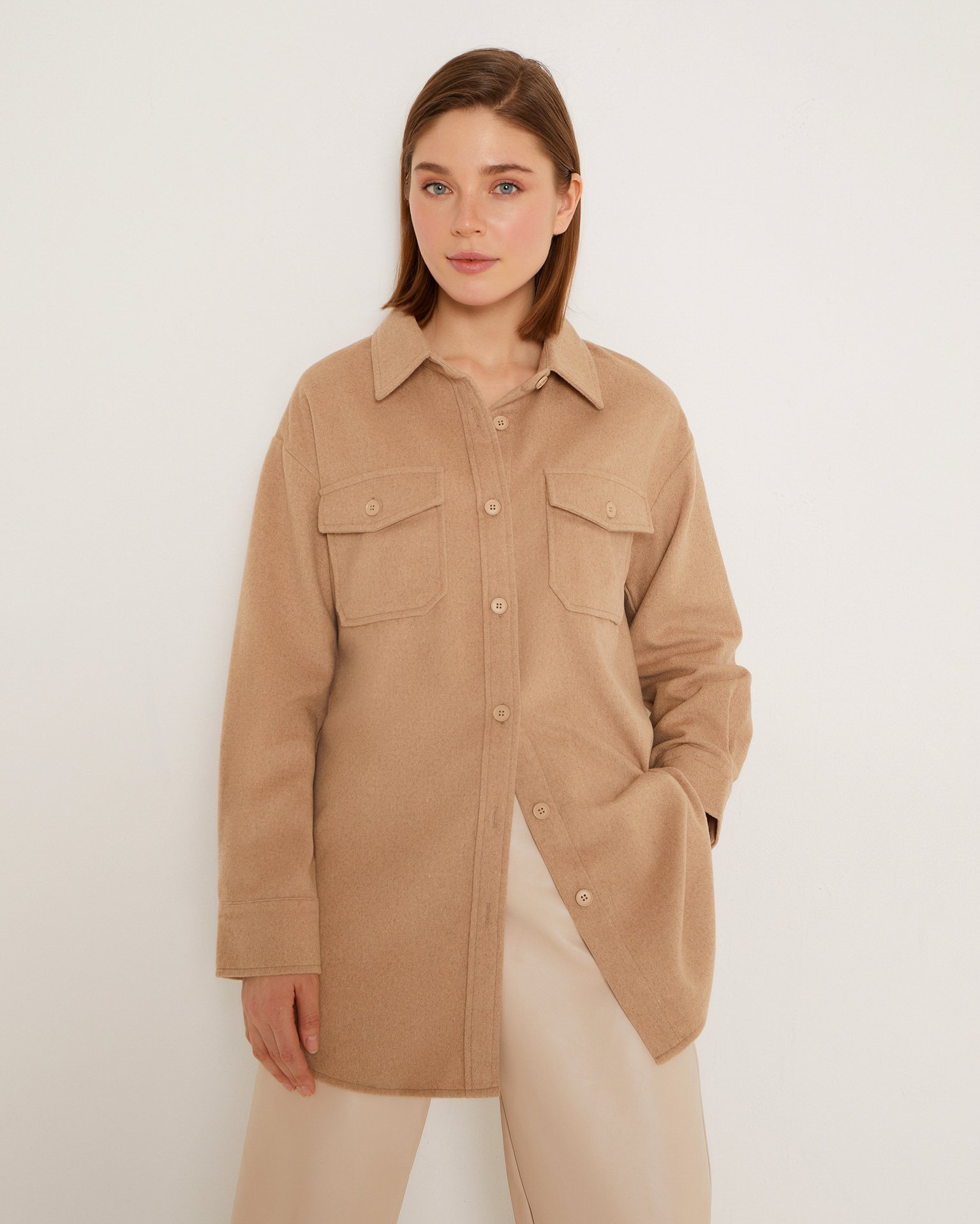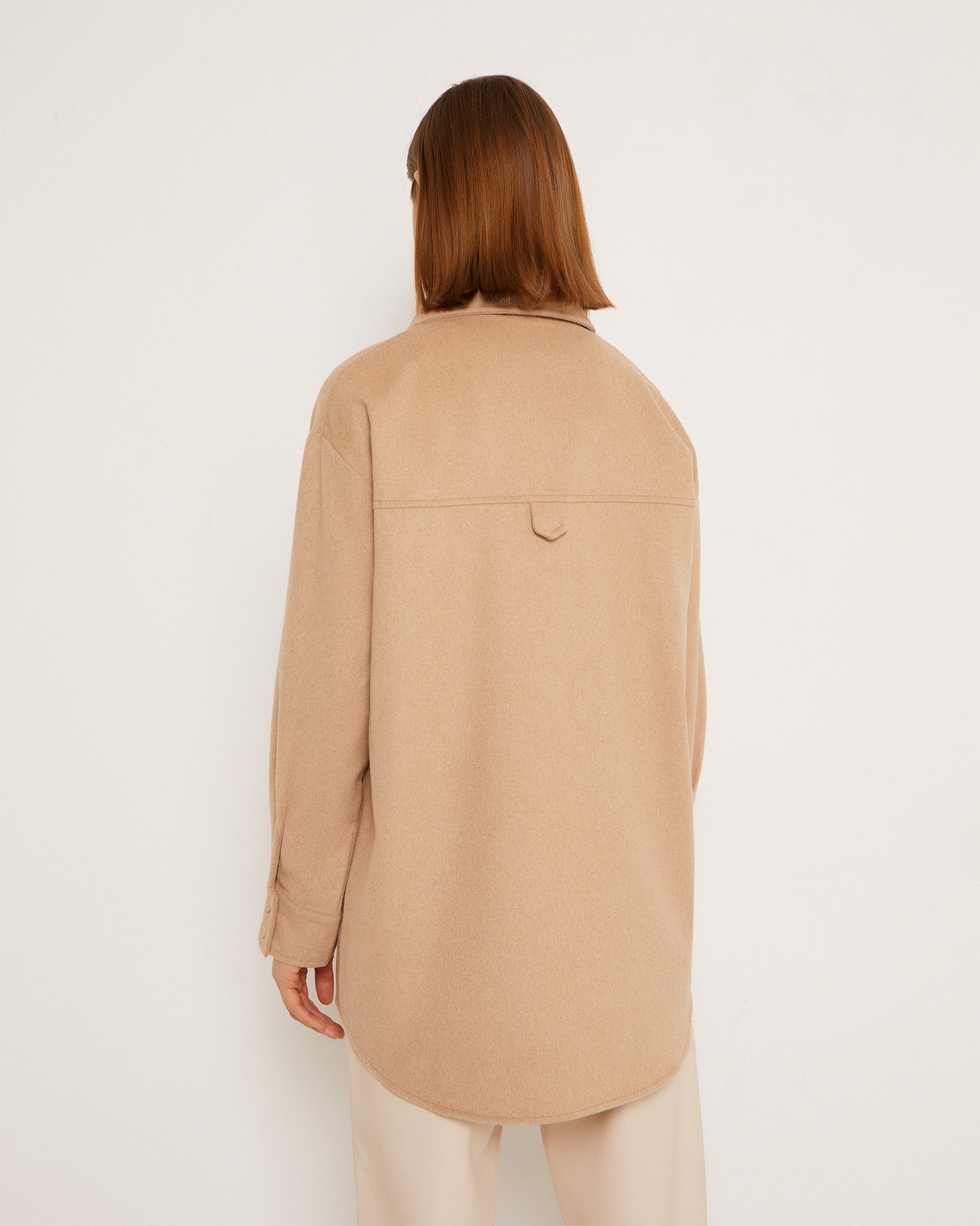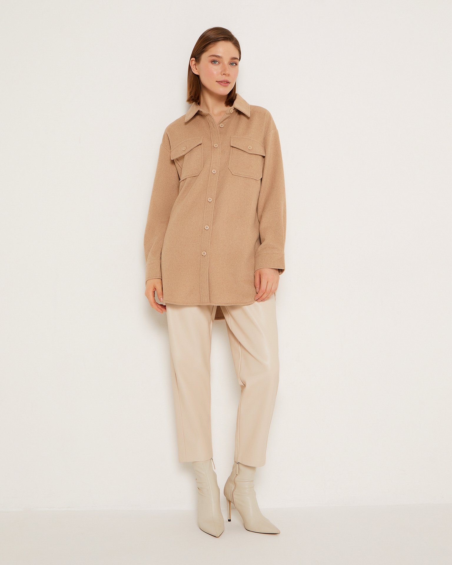Рубашка свободного кроя с чуть приспущенной линией плеча, отложным воротником и двумя накладными карманами на груди. Идеальная рубашка для создания трендовых образов в стиле casual. Шерстяная модель – удачная альтернатива ветровке или кожаной куртке. Носите поверх топов, футболок или тонких водолазок вместе с джинсами или трикотажными брюками-палаццо из нашей коллекции. Параметры модели: рост 175 см, грудь 84 см, талия 63 см, бедра 92 см. Размер на модели: S.