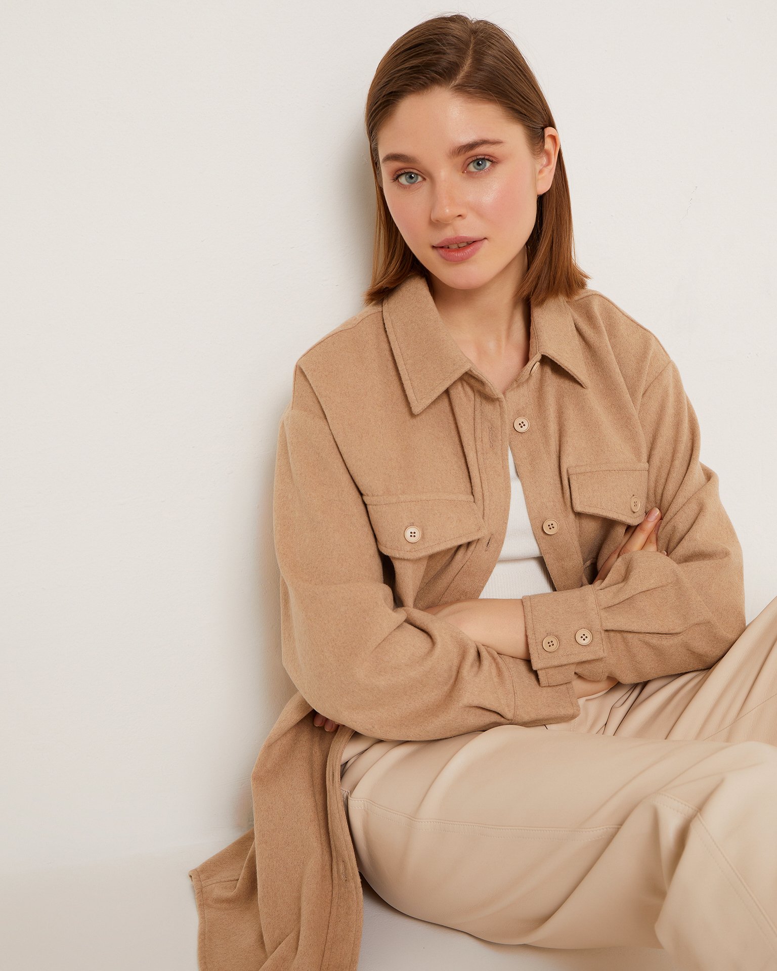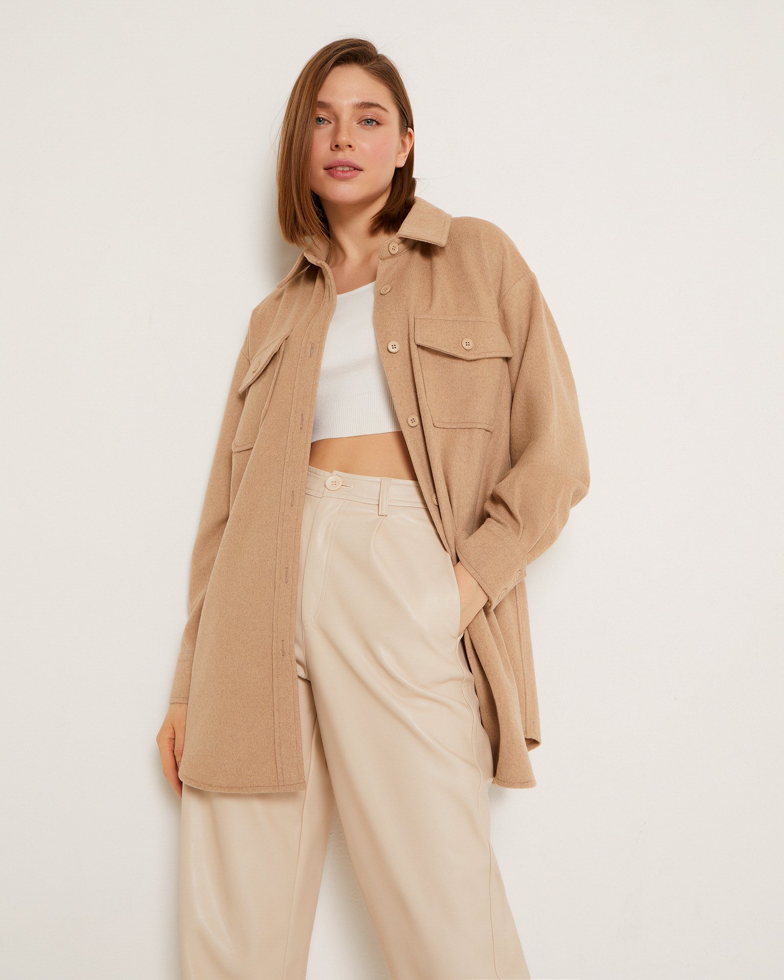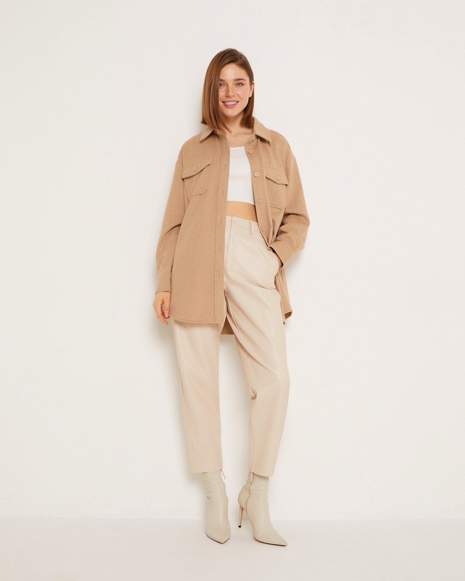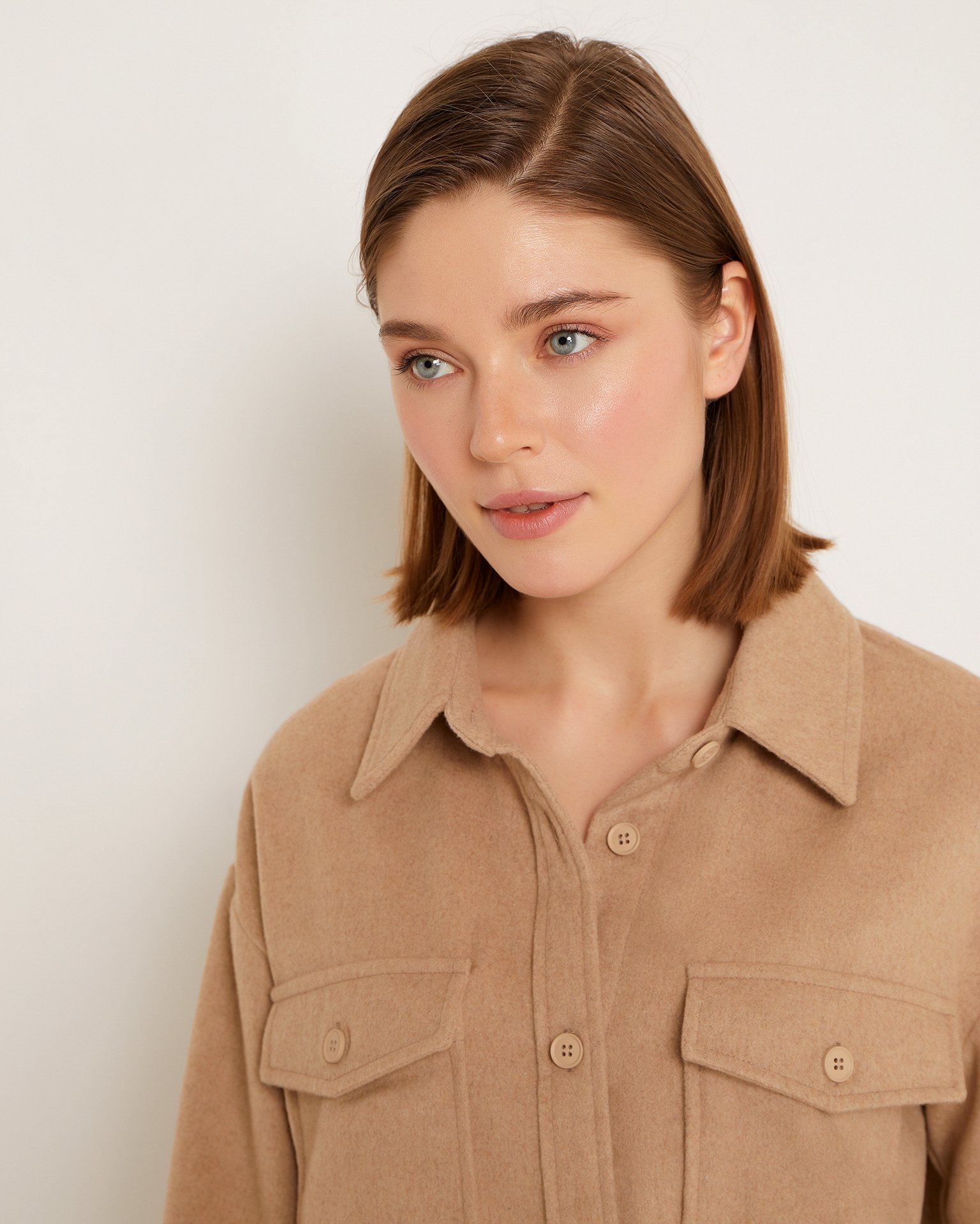 Рубашка свободного кроя с чуть приспущенной линией плеча, отложным воротником и двумя накладными карманами на груди. Идеальная рубашка для создания трендовых образов в стиле casual. Шерстяная модель – удачная альтернатива ветровке или кожаной куртке. Носите поверх топов, футболок или тонких водолазок вместе с джинсами или трикотажными брюками-палаццо из нашей коллекции. Параметры модели: рост 175 см, грудь 84 см, талия 63 см, бедра 92 см. Размер на модели: S.