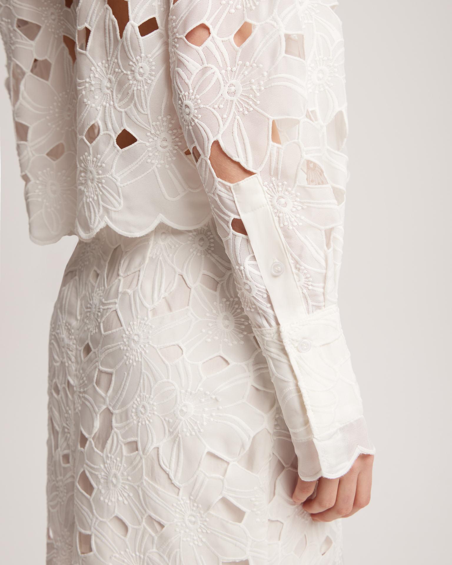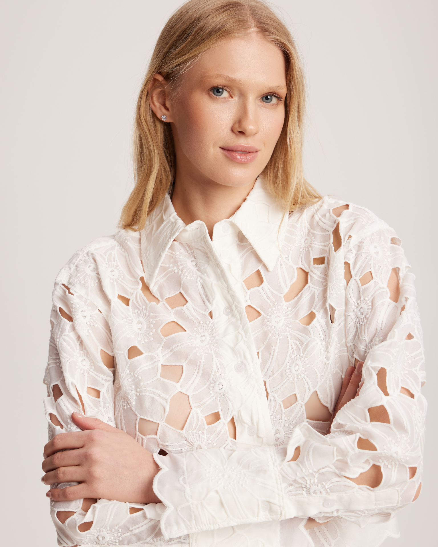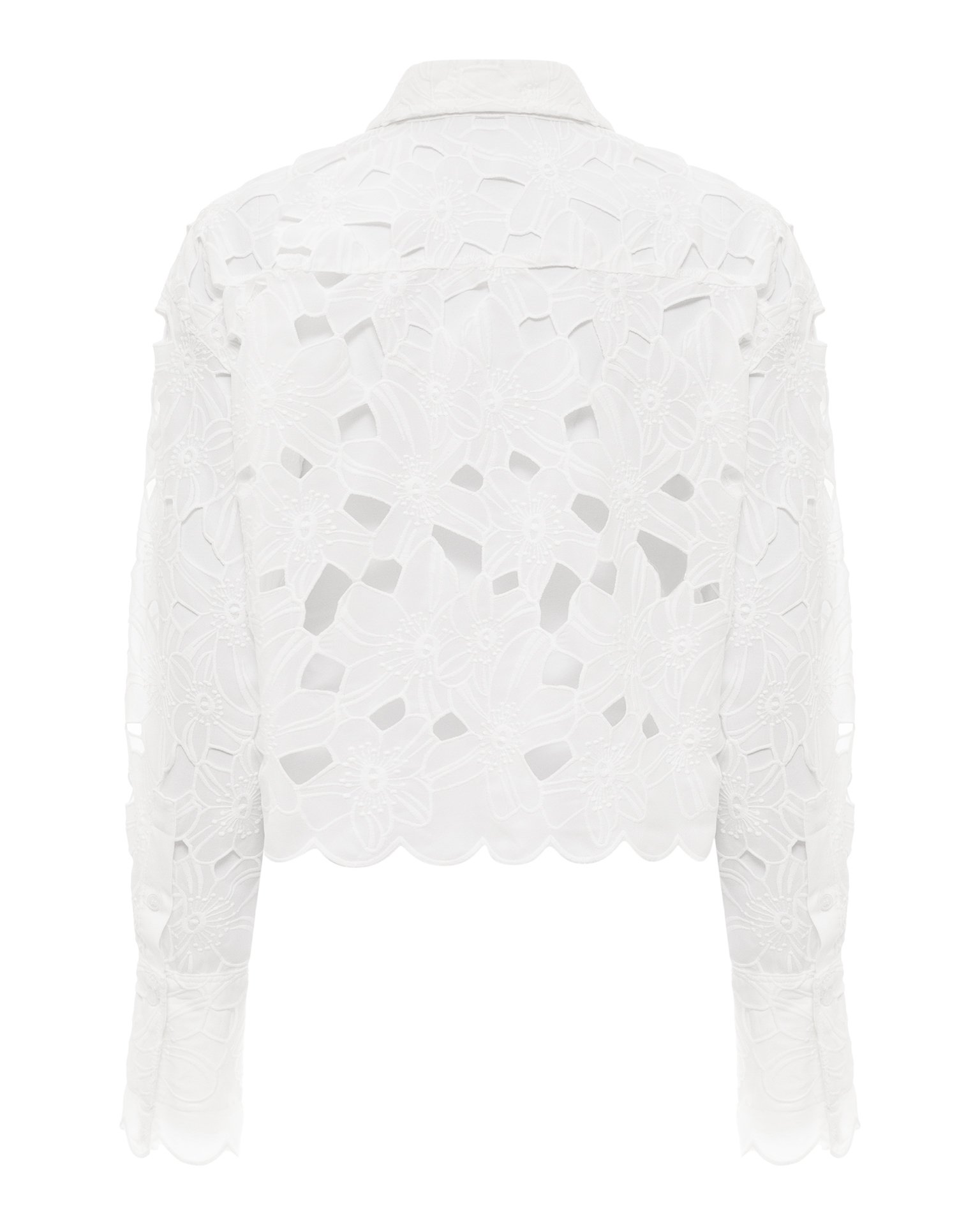 Элегантная белая рубашка с ажурной вышивкой — воплощение утончённого стиля и изысканности. Модель выполнена из лёгкой ткани с изящным цветочным орнаментом, создающим эффект кружевного полотна. Ажурные вырезы формируют неповторимый узор, придавая изделию воздушность и романтичность. Параметры модели: рост 176 см, грудь 85 см, талия 62см, бедра 90 см. Размер на модели: XS/S.