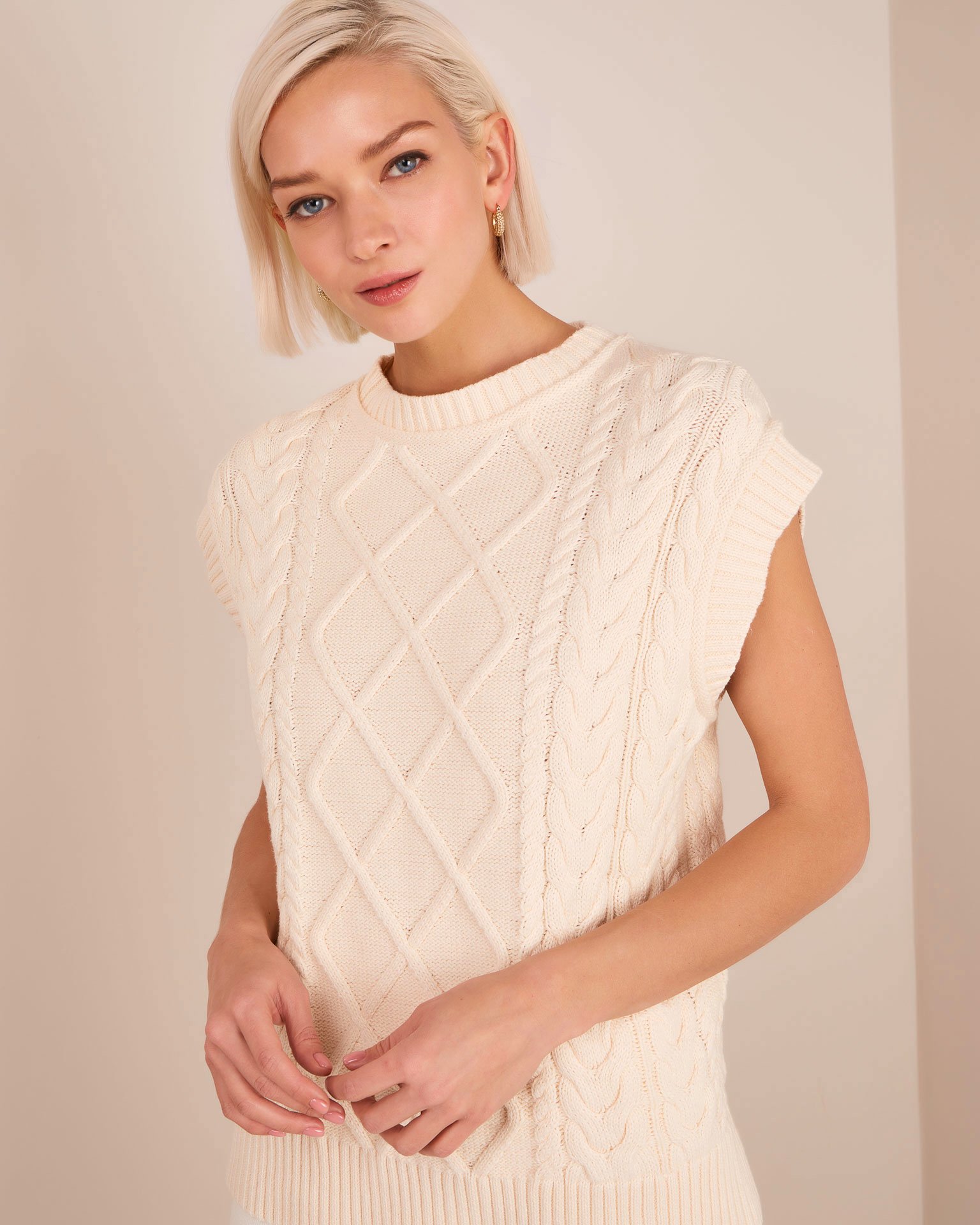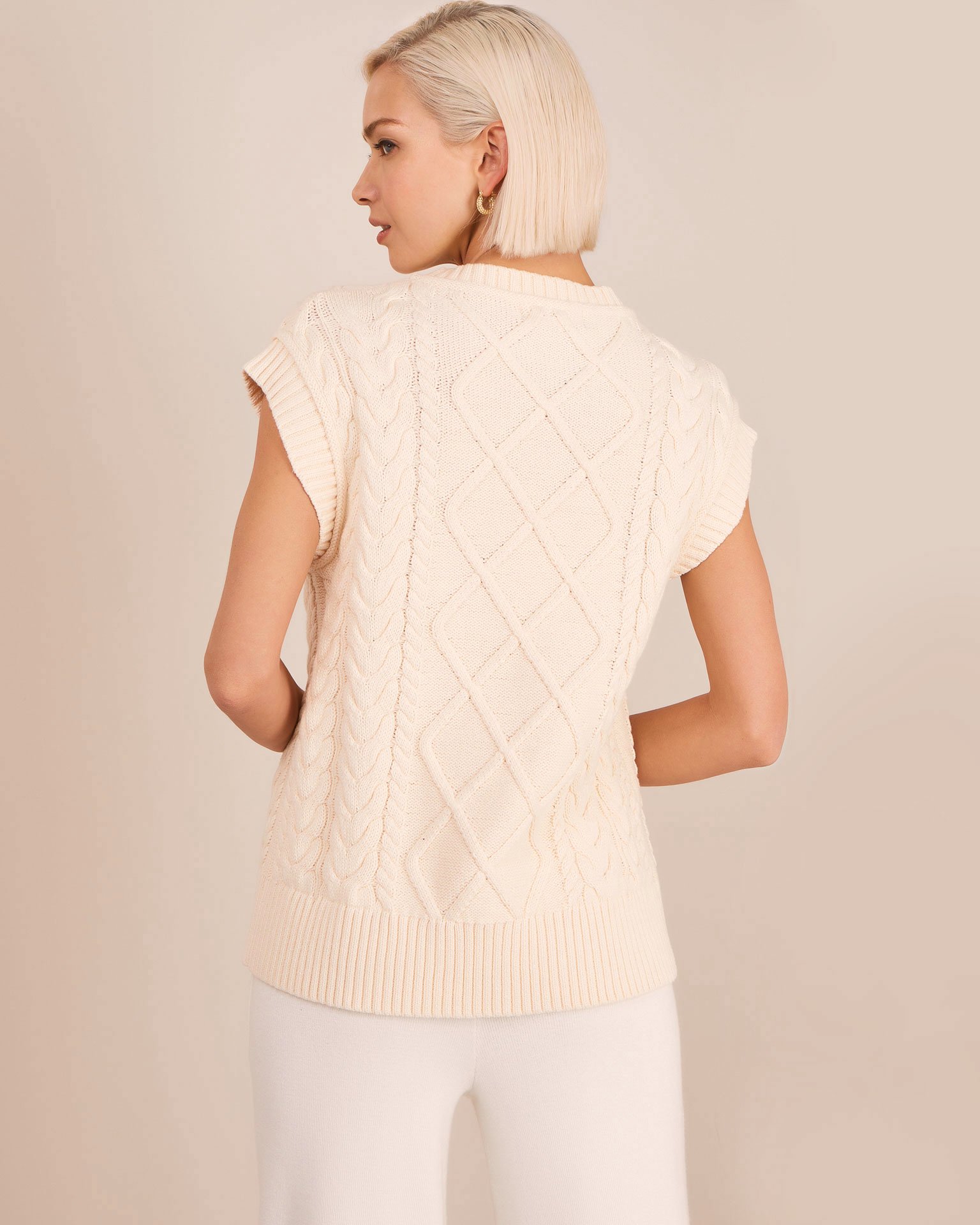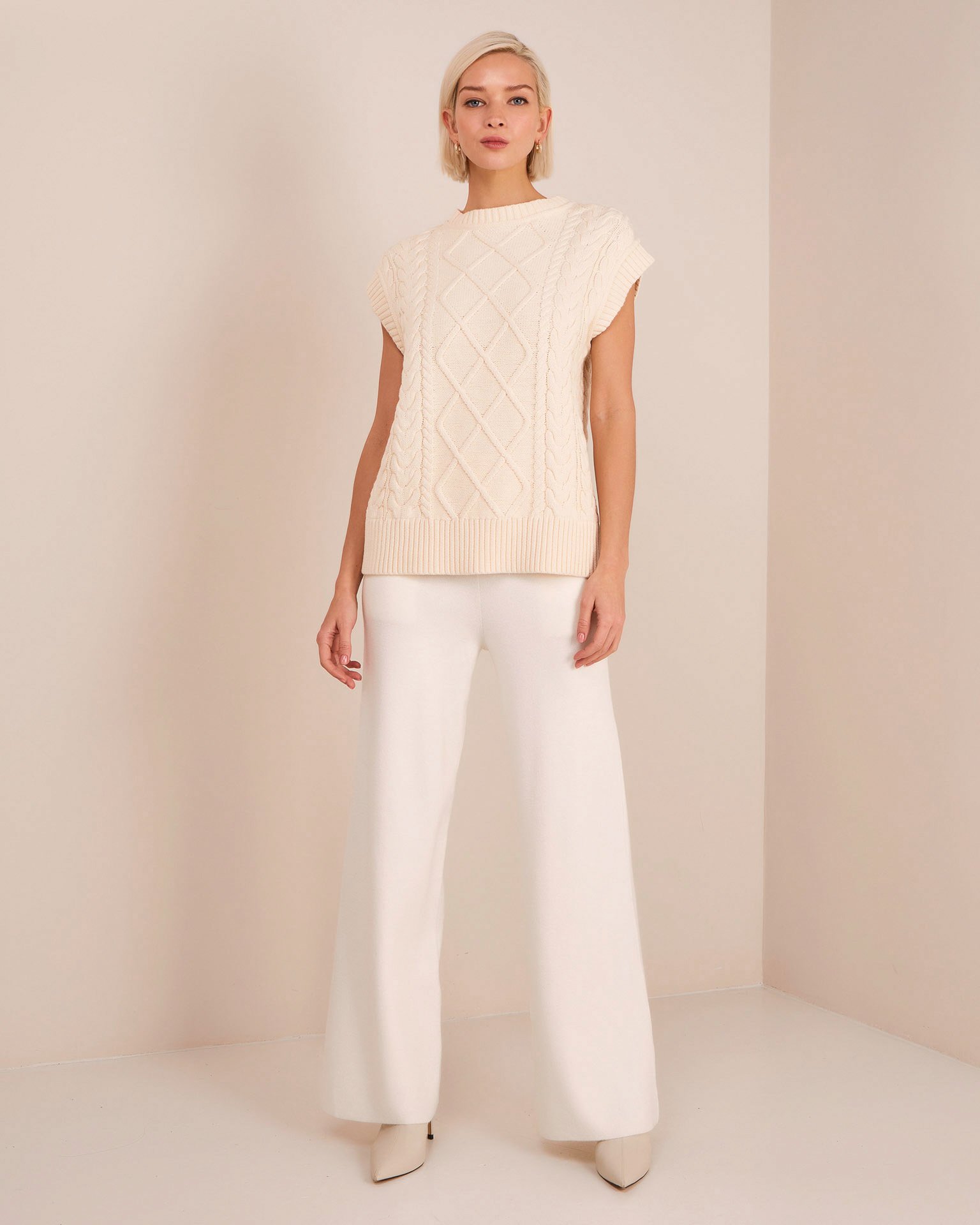 Джемпер без рукавов с фактурным узором косами и ромбами. Обтачка горловины и проймы вывязаны в рельефный рубчик. Нижняя кромка обработана эластичной резинкой. Элегантная зимняя альтернатива привычному свитеру. Сочетайте с брюками прямого кроя и минималистичными украшениями для создания трендового образа. Параметры модели: Рост 174 см, грудь 89 см, талия 61 см, бёдра 88 см.