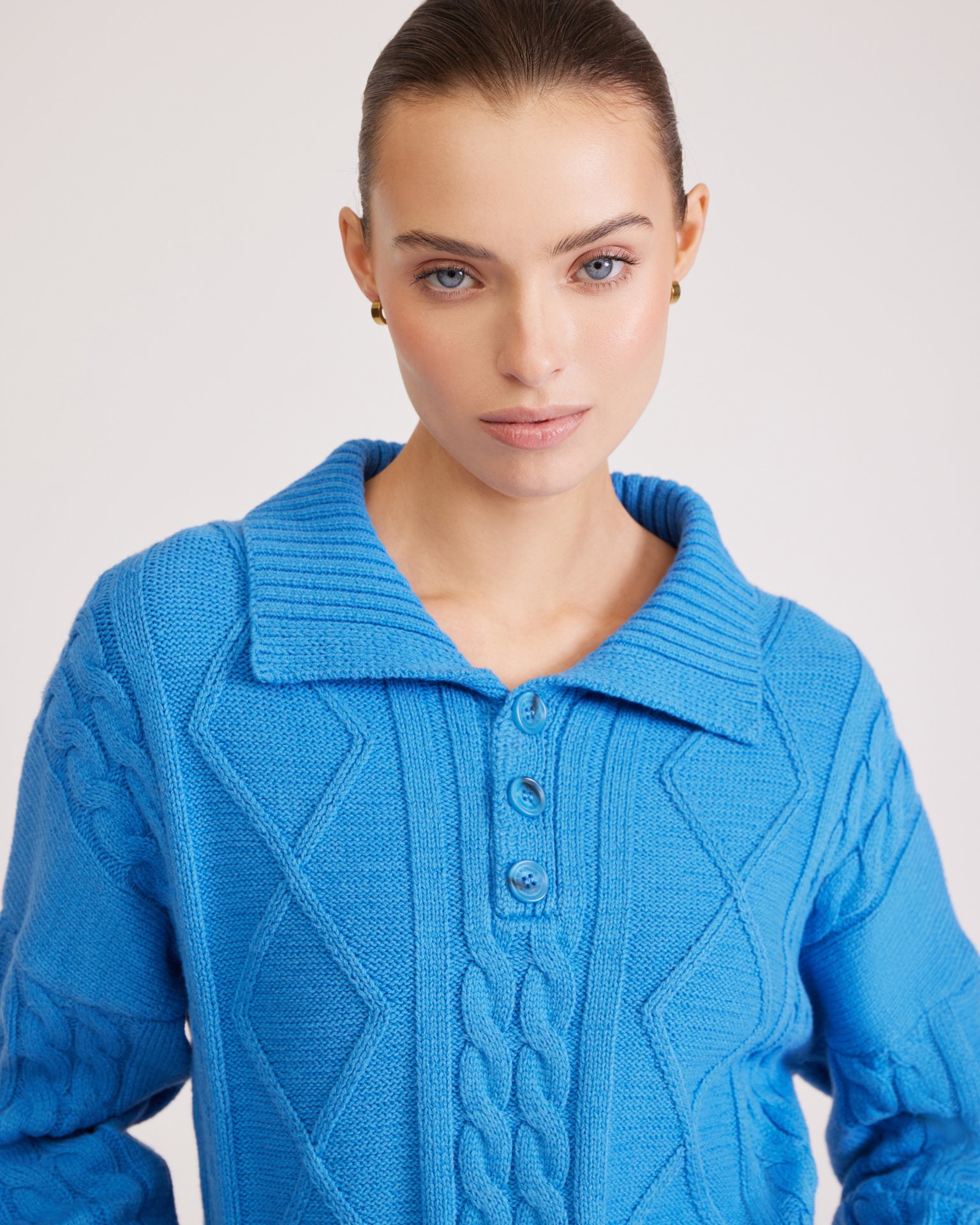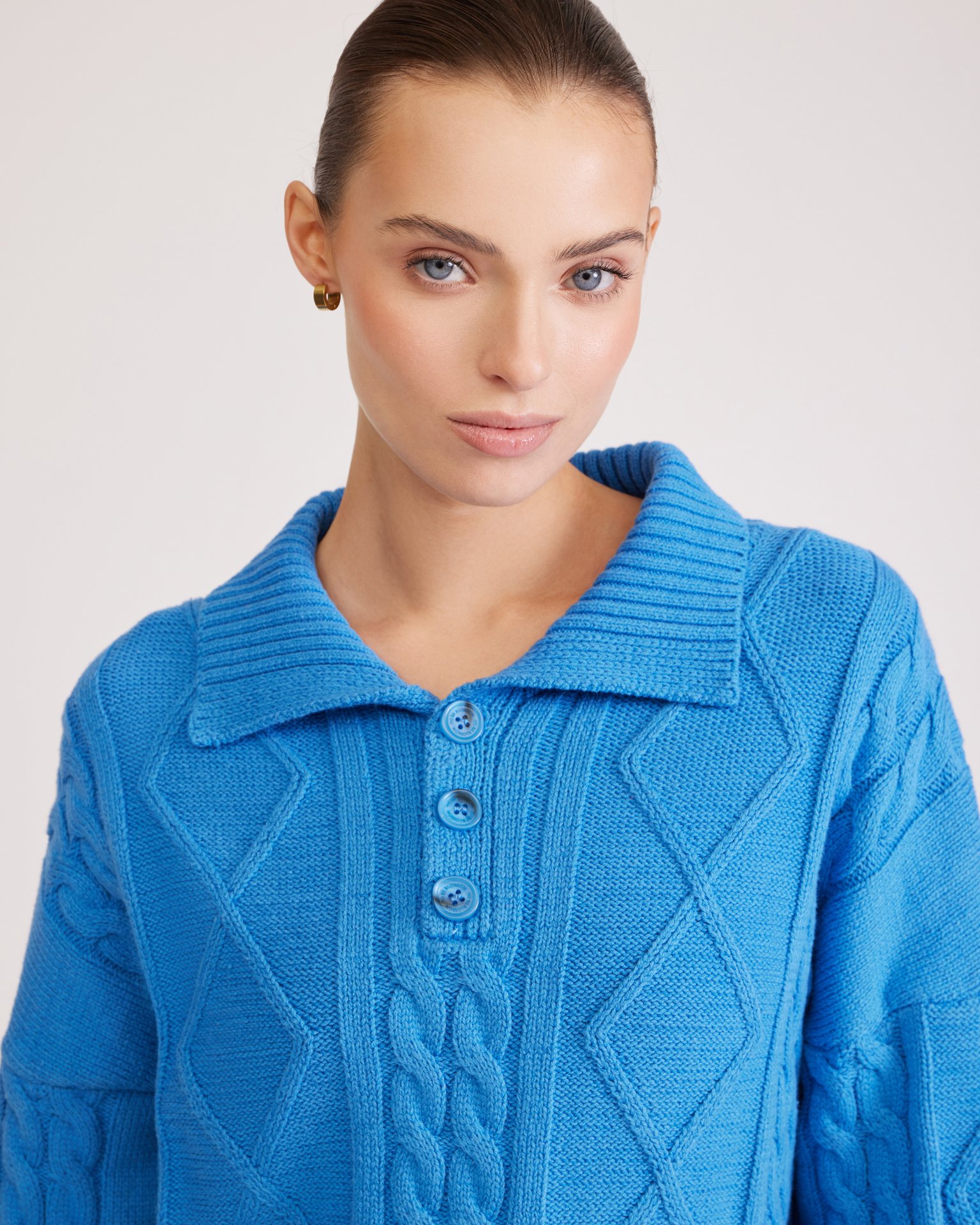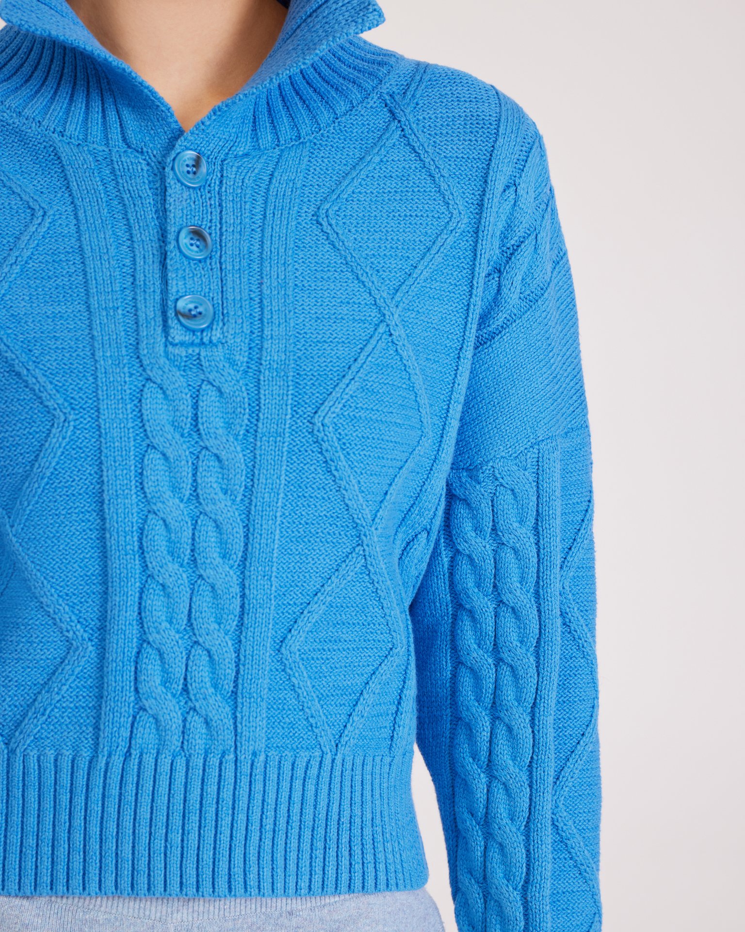 Джемпер в насыщенном голубом цвете с отложным воротником, фактурными узорами, крупными пуговицами в тон и спущенной плечевой линией выполнен из комфортной пряжи на основе хлопка. Такая модель хорошо сочетается с юбками и брюками с высокой посадкой. Состав: 45% хлопок, 55% акрил Параметры модели: рост 177, грудь 84, талия 61, бедра 92 Размер на модели: S