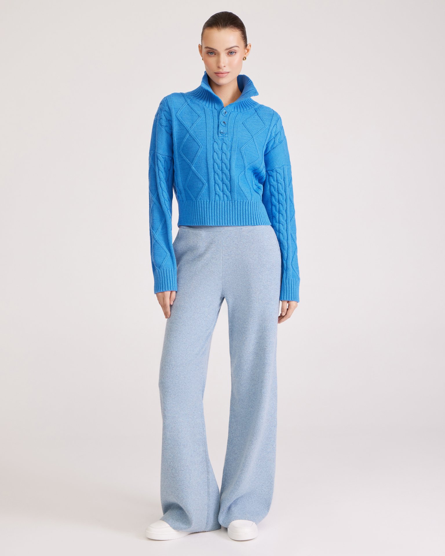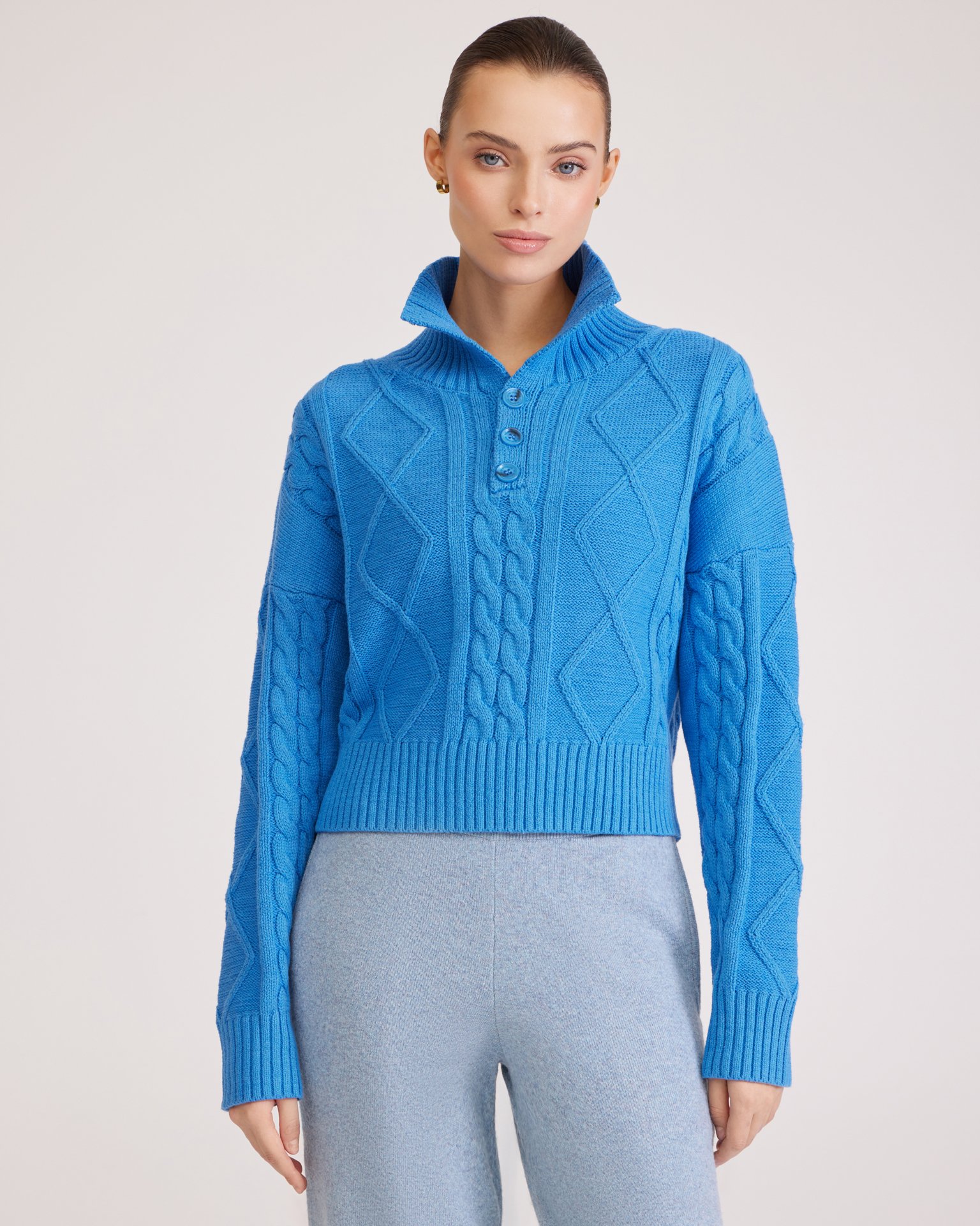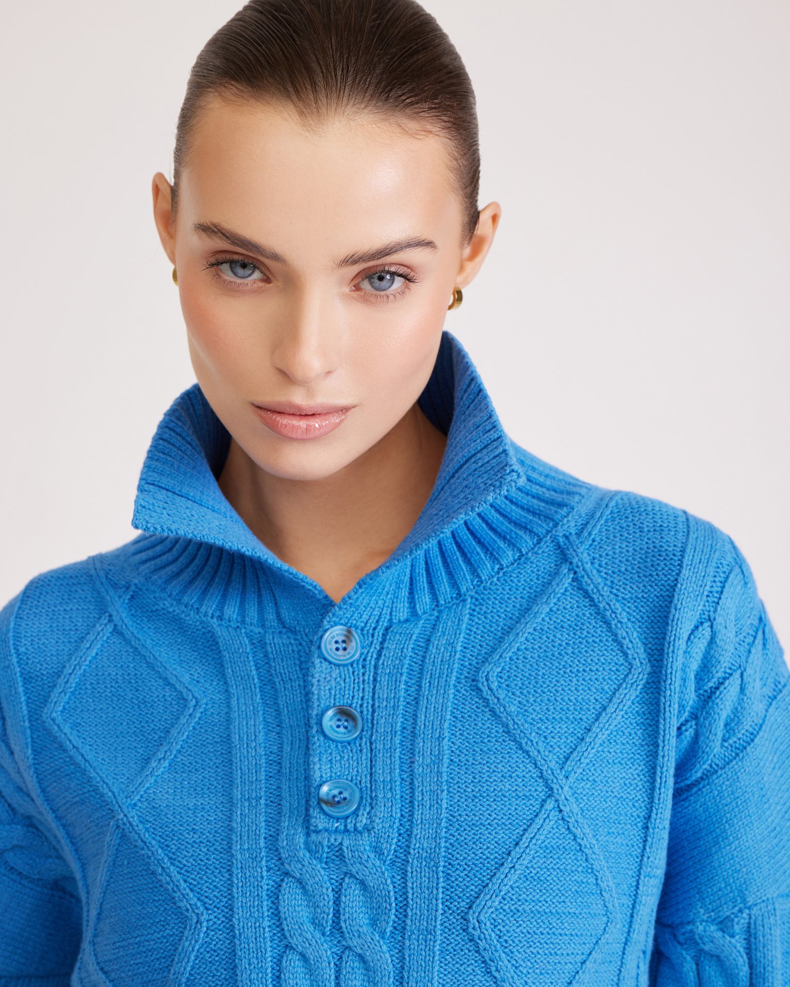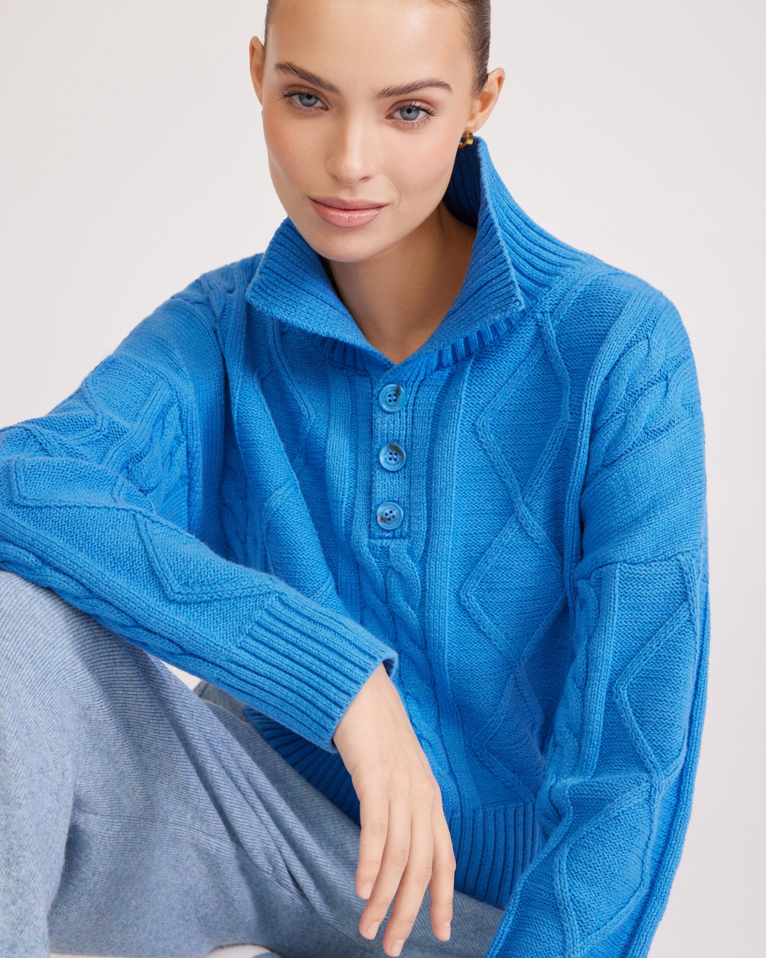 Джемпер в насыщенном голубом цвете с отложным воротником, фактурными узорами, крупными пуговицами в тон и спущенной плечевой линией выполнен из комфортной пряжи на основе хлопка. Такая модель хорошо сочетается с юбками и брюками с высокой посадкой. Состав: 45% хлопок, 55% акрил Параметры модели: рост 177, грудь 84, талия 61, бедра 92 Размер на модели: S