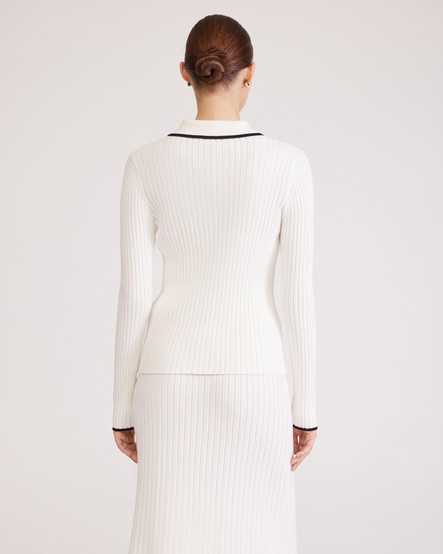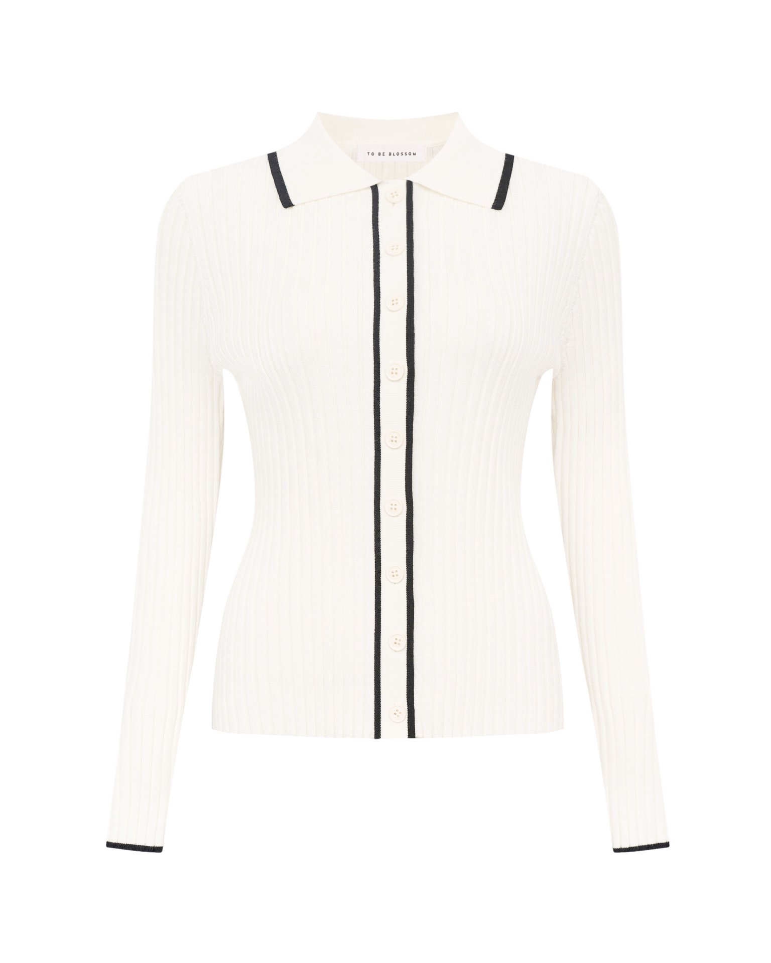 Прилегающий кардиган с воротником-поло в белом цвете. Кардиган дополнен пуговицами в тон и контрастной черной окантовкой. Модель выполнена из мягкой ткани в рубчик на основе вискозы. Выбирайте юбку миди из того же материала, чтобы создать комфортный и стильный образ. Параметры модели: рост 177, грудь 84, талия 61, бедра 92. Размер на модели: S.