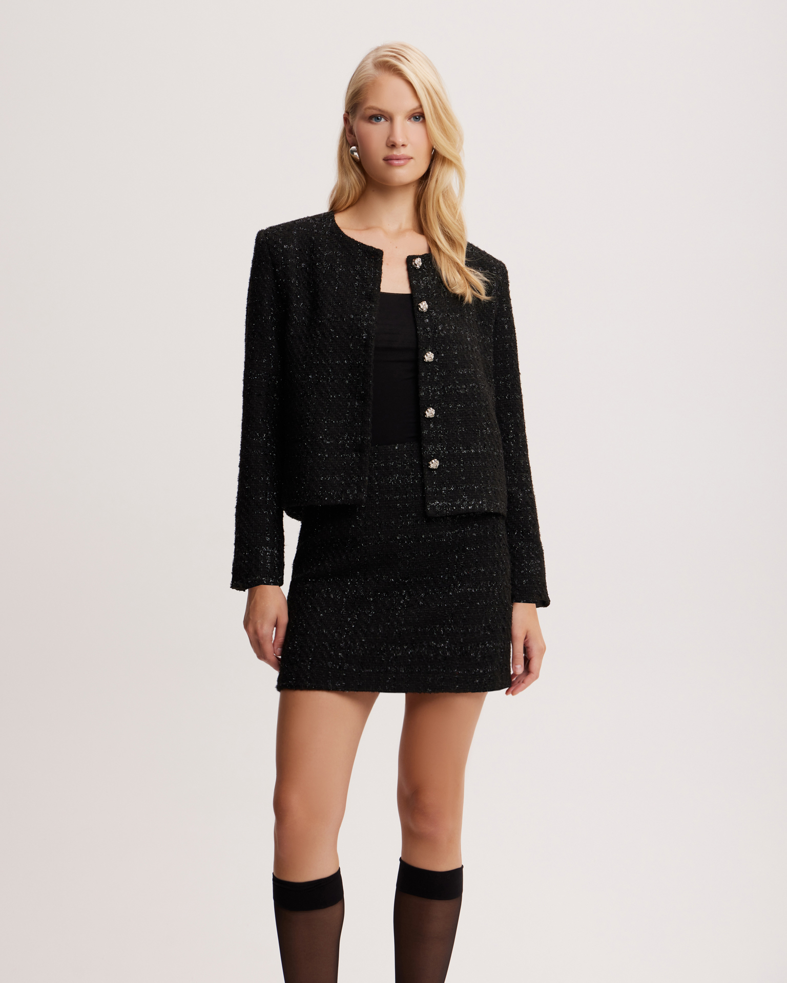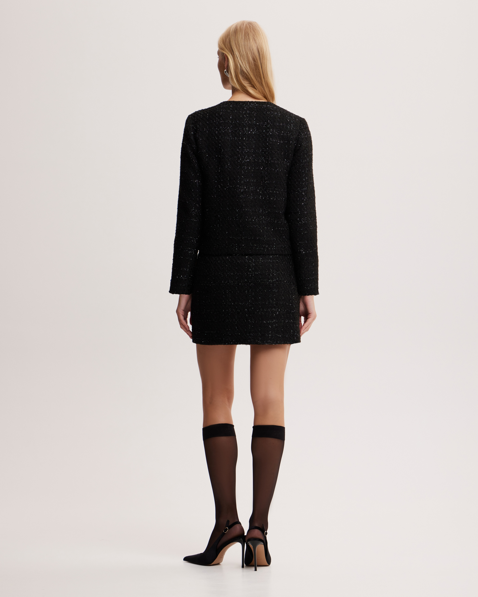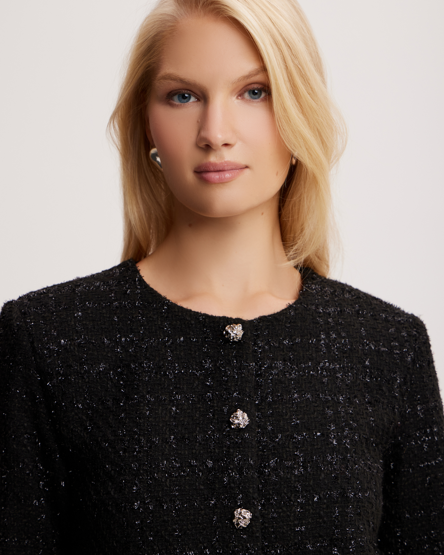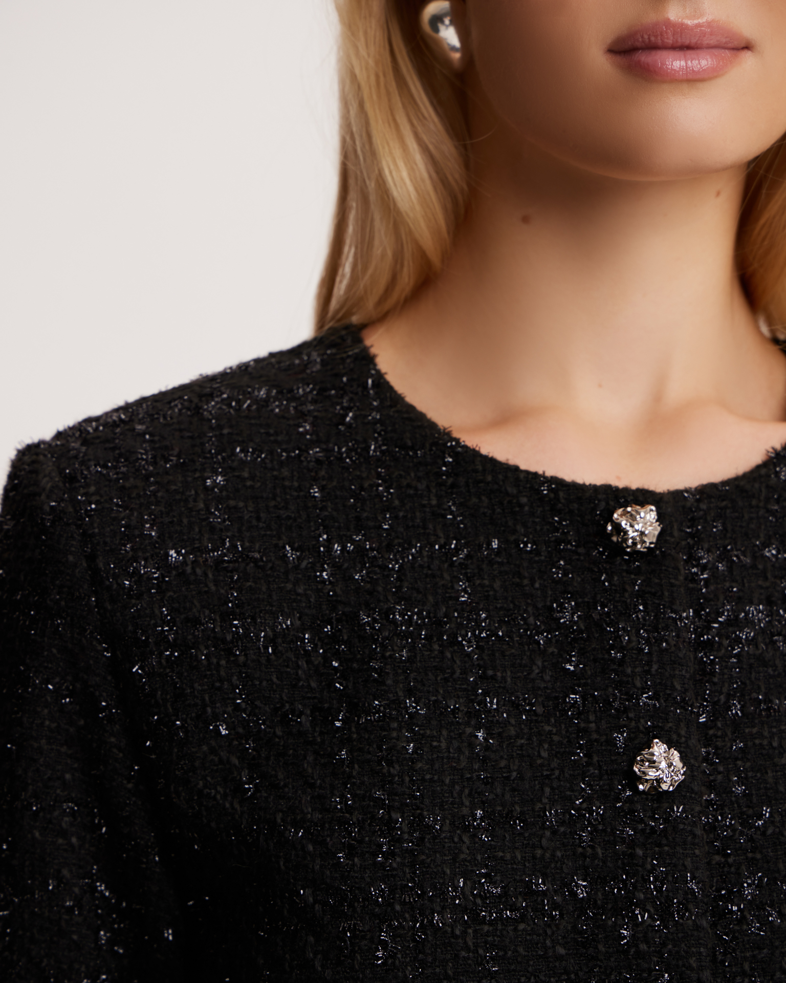Твидовый однобортный жакет прямого кроя с круглым вырезом и лёгкими вкраплениями блестящей нити в тон подойдёт на каждый день и для особых случаев. Жакет можно дополнить твидовой юбкой из той же коллекции для создания гармоничного образа. Параметры модели: рост 178 см, грудь 84 см, талия 60 см, бедра 92 см. Размер на модели: S.