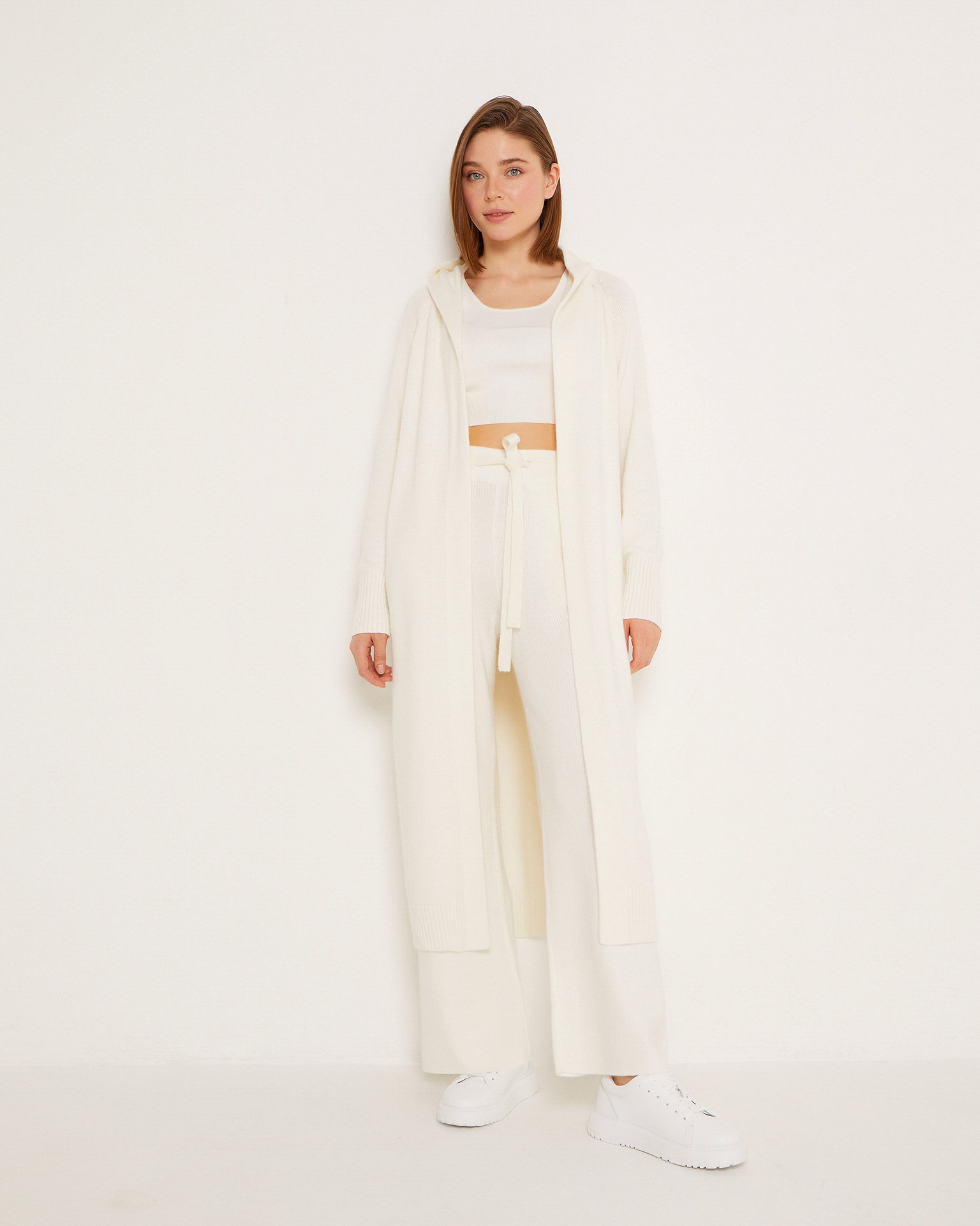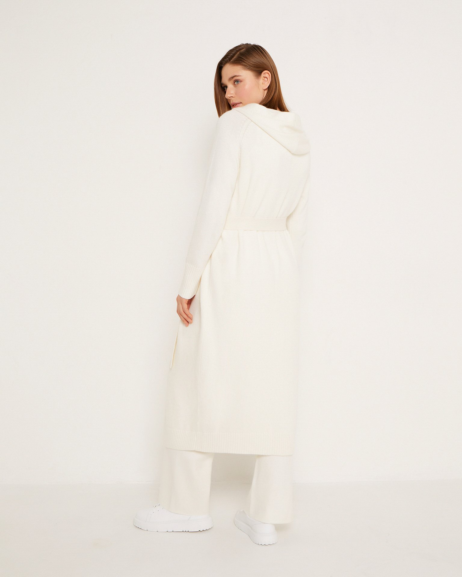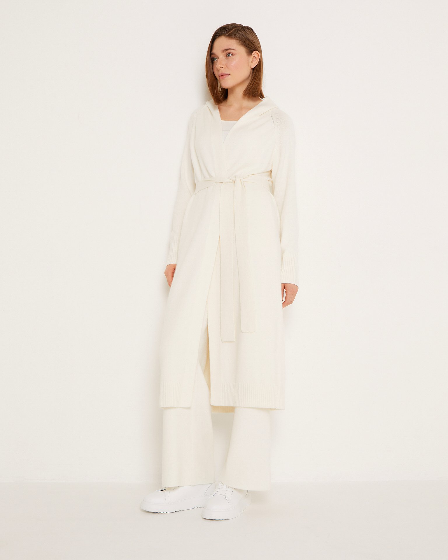 Длинный кардиган без пуговиц с капюшоном. Манжеты и края обработаны резинкой. Пояс в тон идет в комплекте. Благодаря нейтральному оттенку с этим кардиганом можно создать различные образы. Для расслабленных прогулок сочетайте с брюками и топами того же цвета, или, наоборот, носите с яркими футболками или лонгсливами и джинсами. Параметры модели: рост 175 см, грудь 84 см, талия 63 см, бедра 92 см.