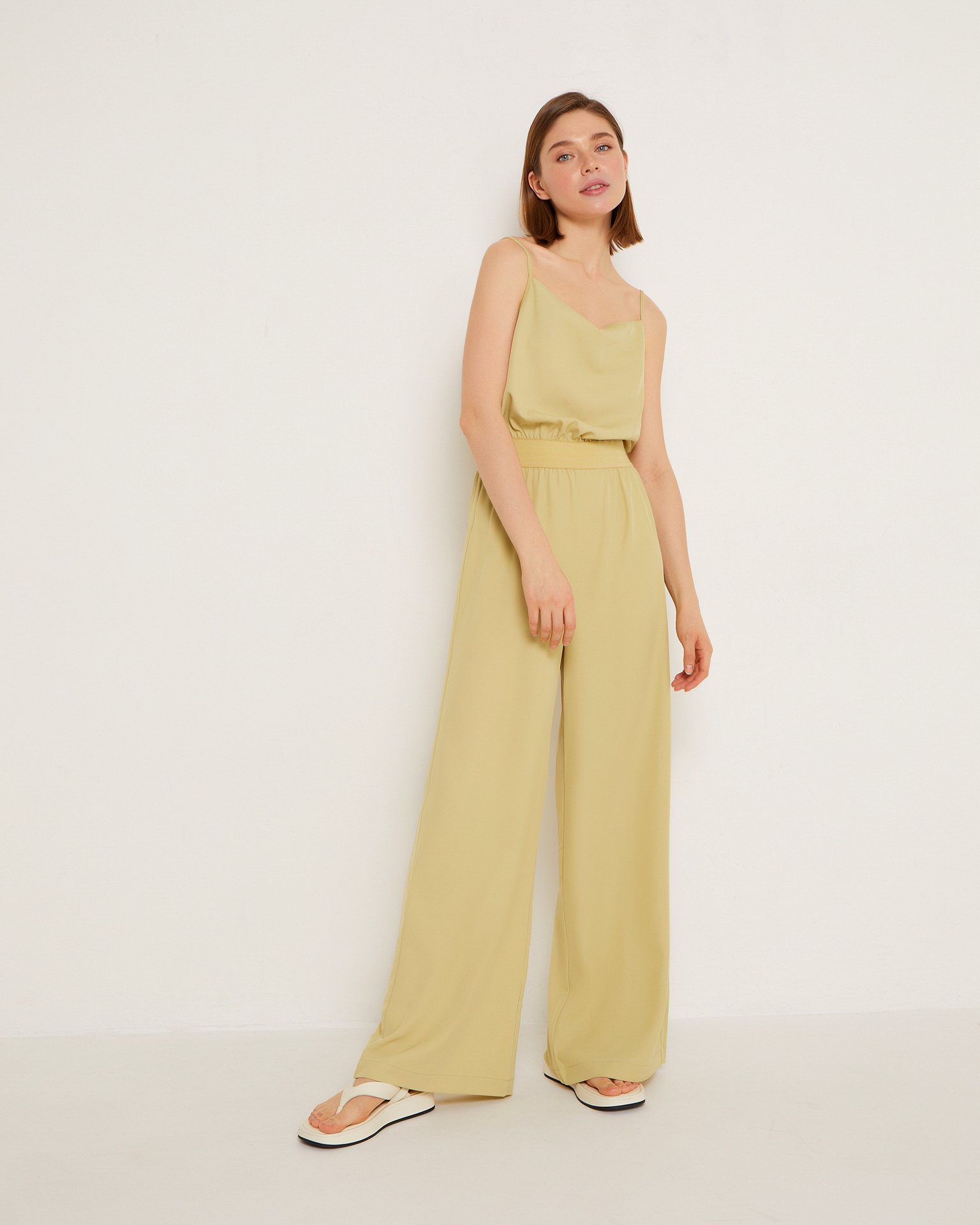 Легкий комбинезон. Верхняя часть – топ на бретелях с глубоким фактурным вырезом, струящиеся прямые свободные брюки. Резинка подчеркивает талию. Универсальный предмет одежды. Создавайте образы в стиле casual с обувью на низкой подошве – кедами или босоножками. Для вечернего образа добавьте декоративный пояс и элегантную обувь на шпильке. Состав: 80% полиэстер, 20% вискоза Параметры модели: Рост 173 см, грудь 80 см, талия 58 см, бедра 85 см