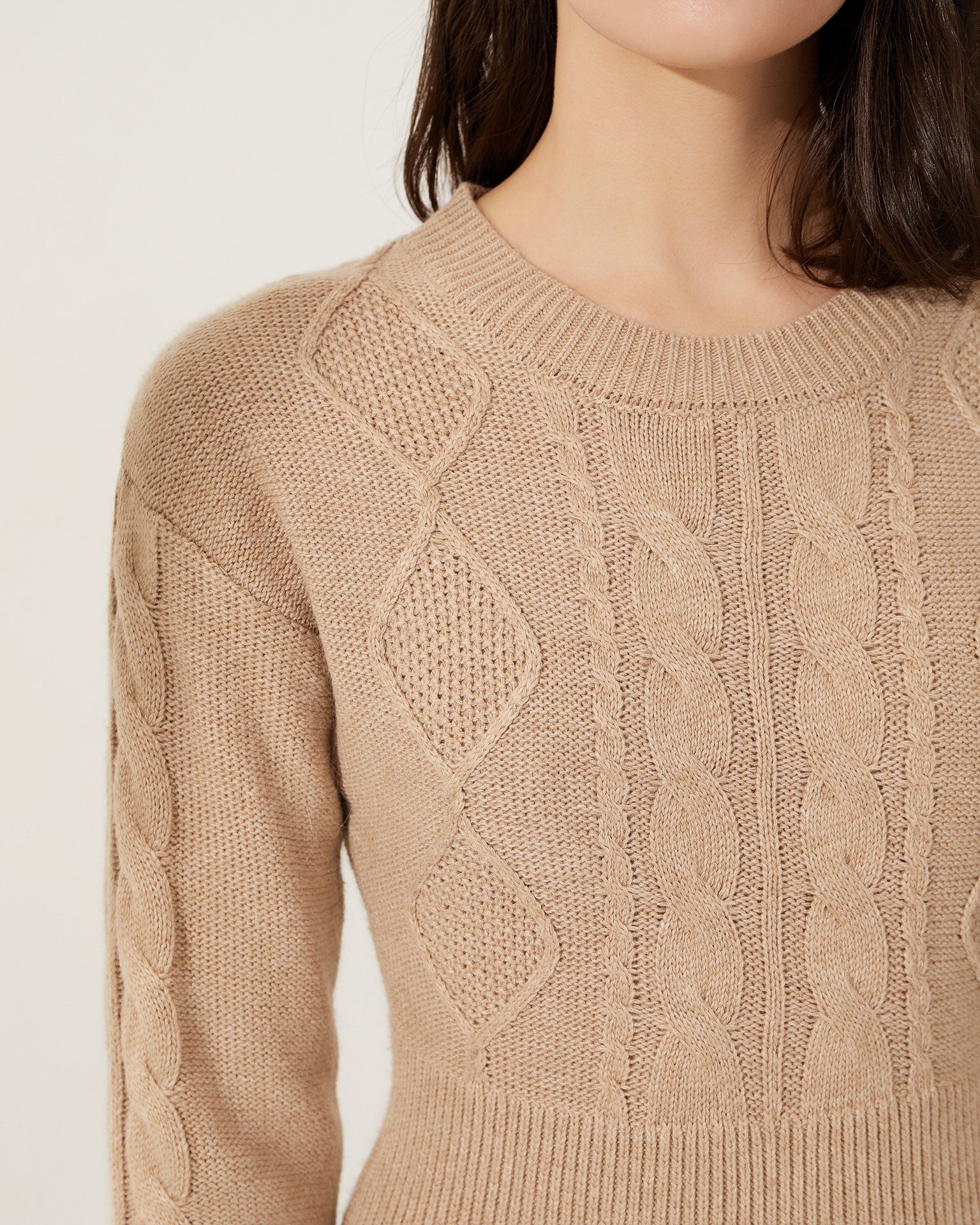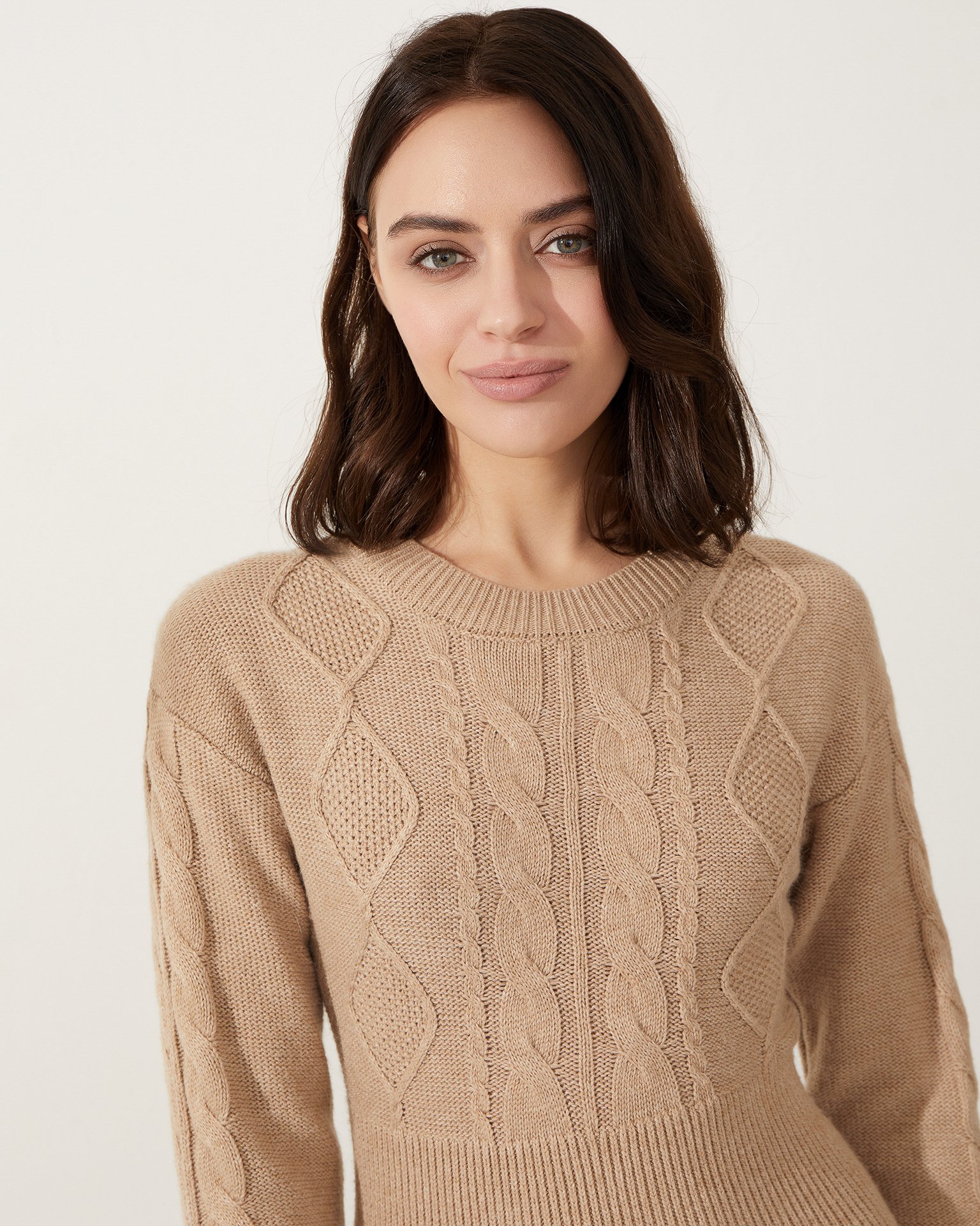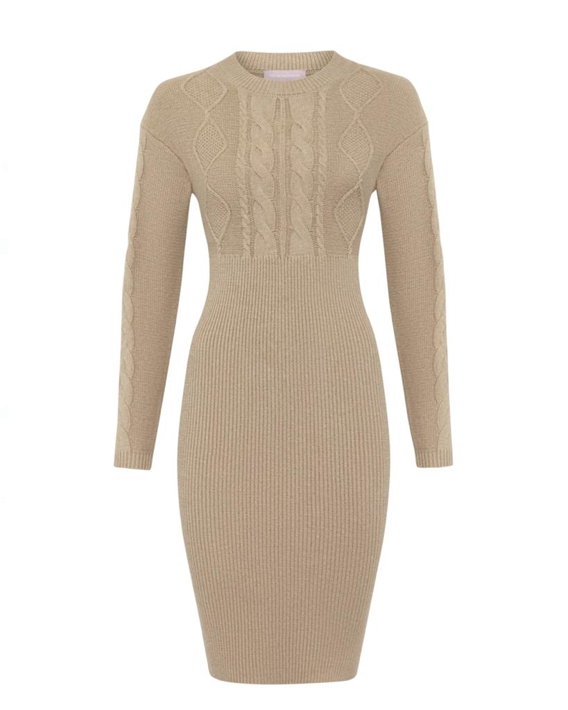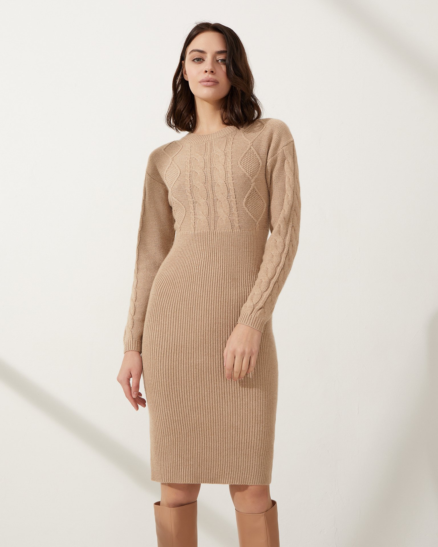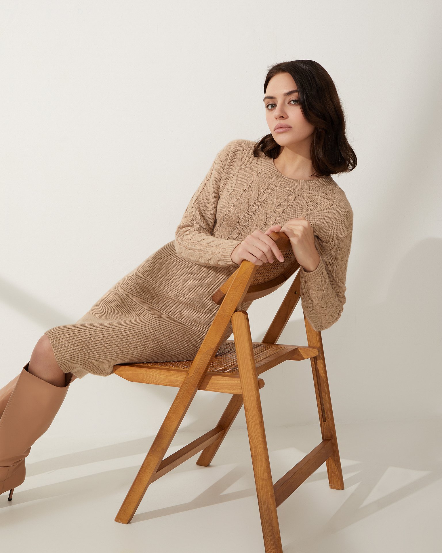 Вязанное платье-футляр до колена. Облегающее платье с длинными рукавами и круглым вырезом. Верхняя часть связана ажурным узором, юбка и рукава – резинкой. Приталенное вязанное платье из кашемира – популярна модель в этом сезоне. Его легко сочетать с разными аксессуарами, каждый день создавая новый образ. В сочетании с элегантными высокими сапогами такое платье впишется даже в офисный гардероб. Параметры модели: Рост 174 см, талия 59 см, бедра 87 см.