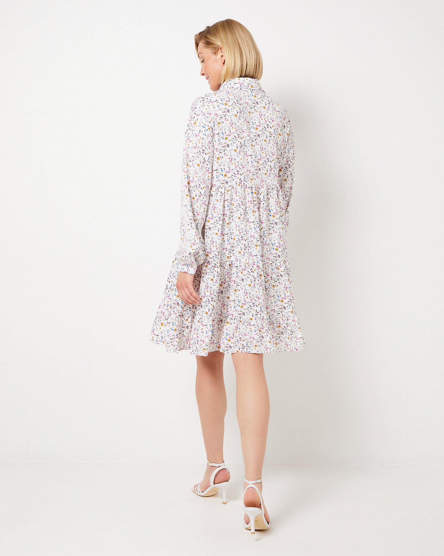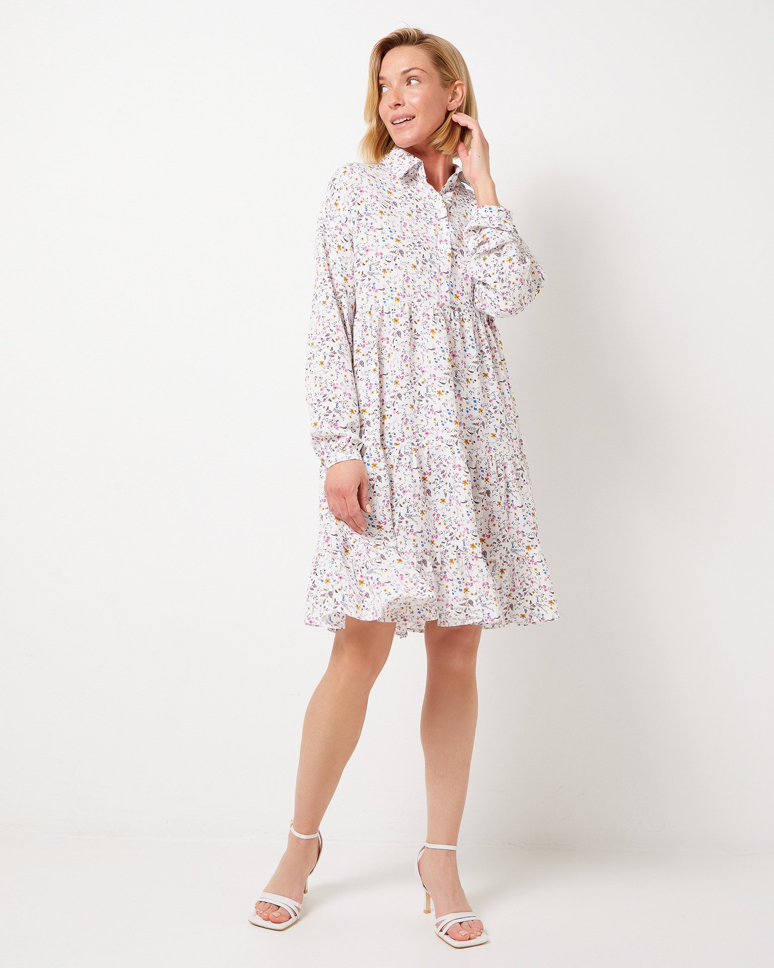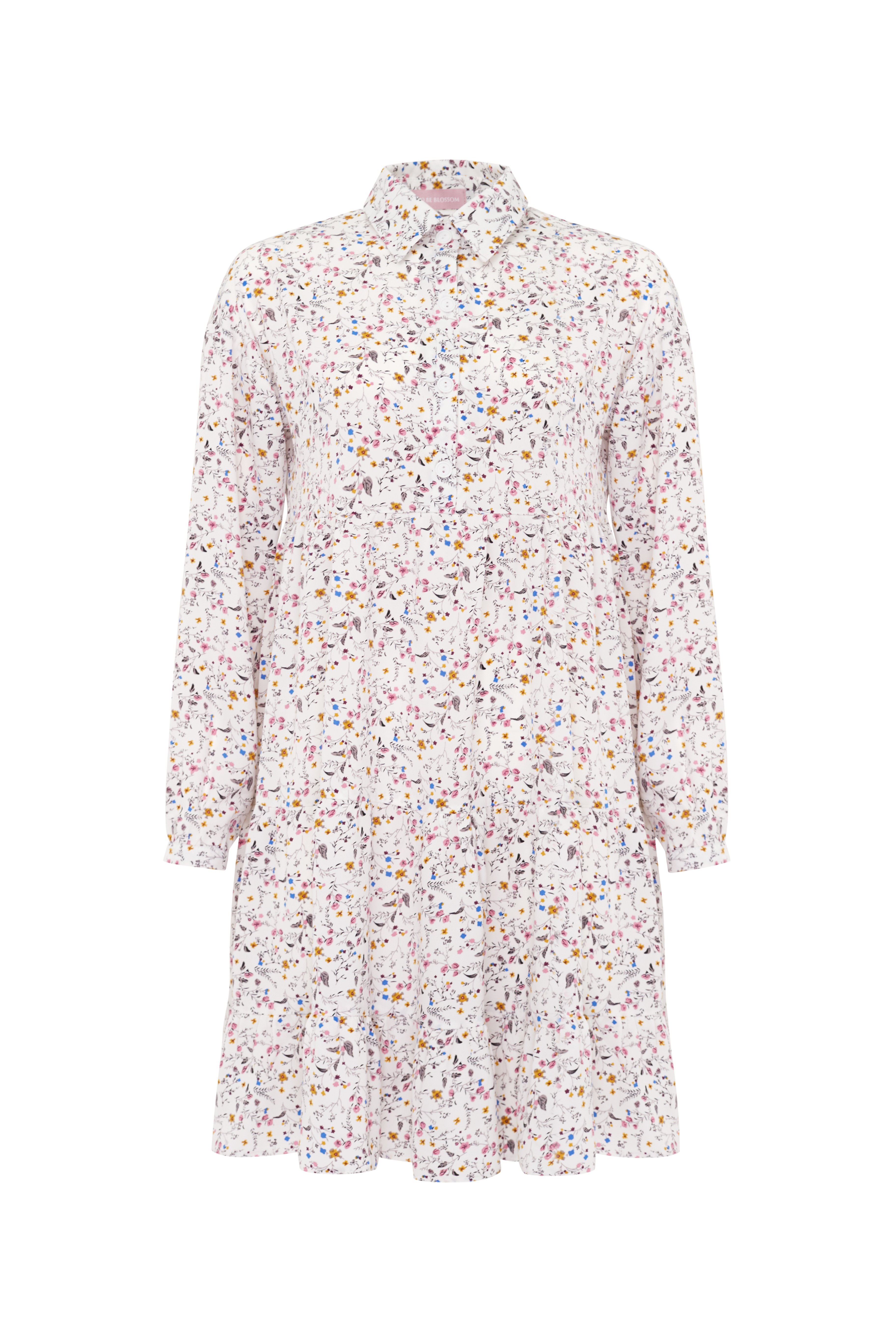 Платье с принтом, с длинными рукавами. Застежка на пуговицы на груди, рубашечный ворот, акцент на талии и юбка с воланом. Платья с цветочными принтами в этом сезоне возвращаются в гардероб всех модниц. Эту модель можно сочетать с объемными кардиганами или кожаной курткой, грубыми ботинками или элегантными босоножками, а можно дополнить необычными аксессуарами и создать образ в актуальном стиле бохо.