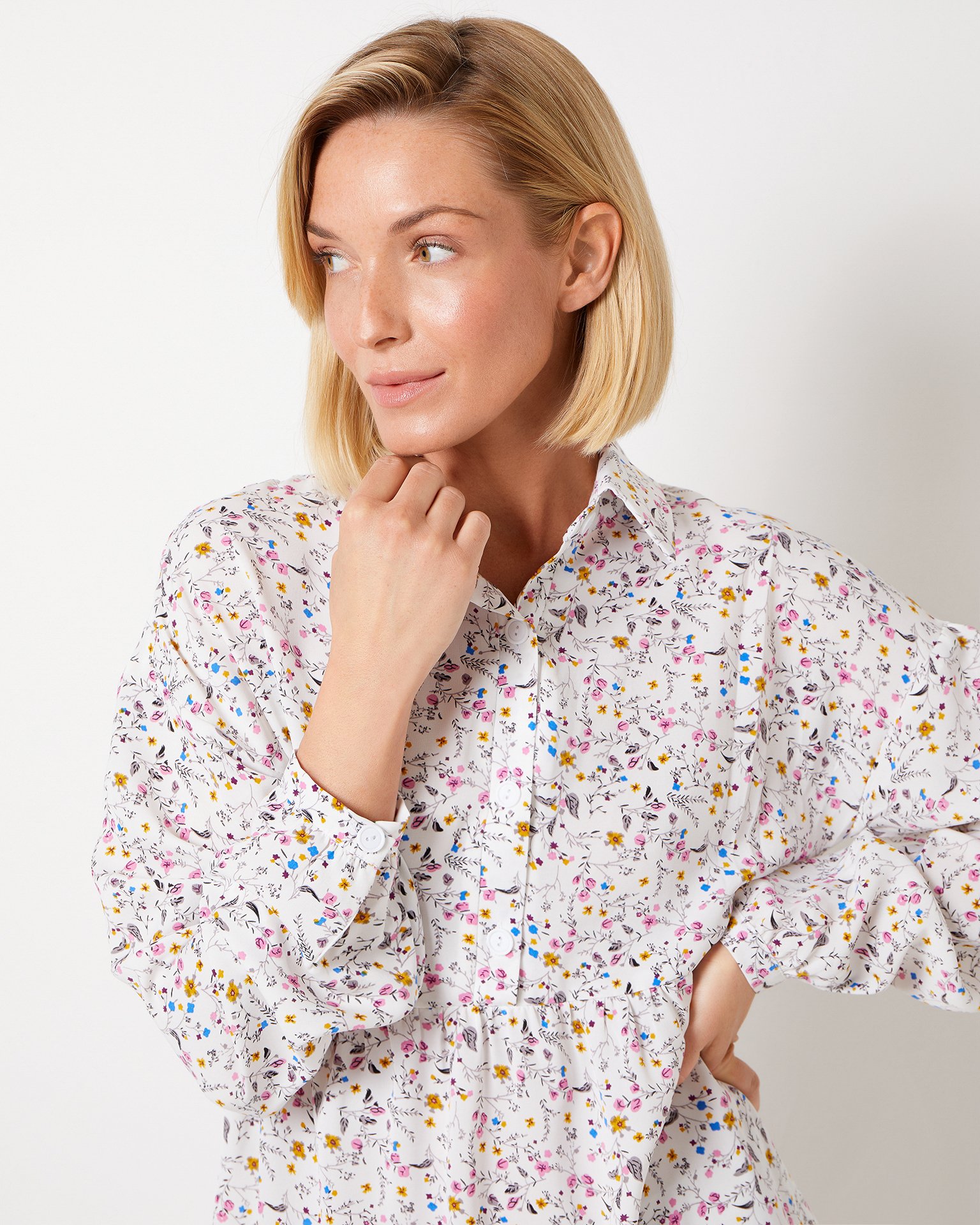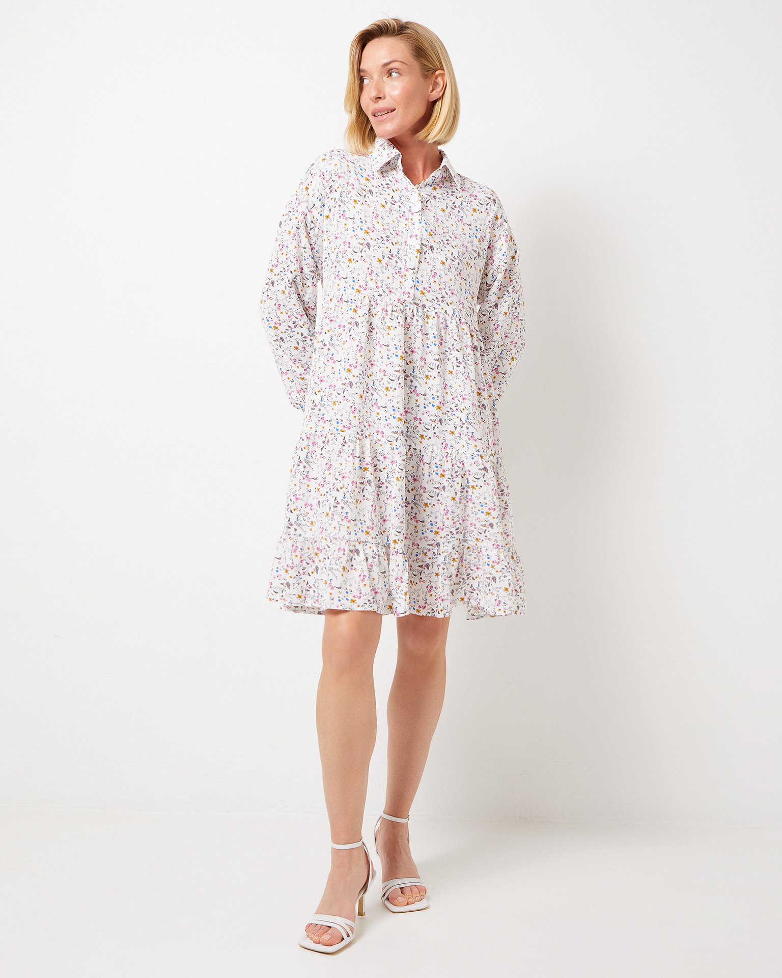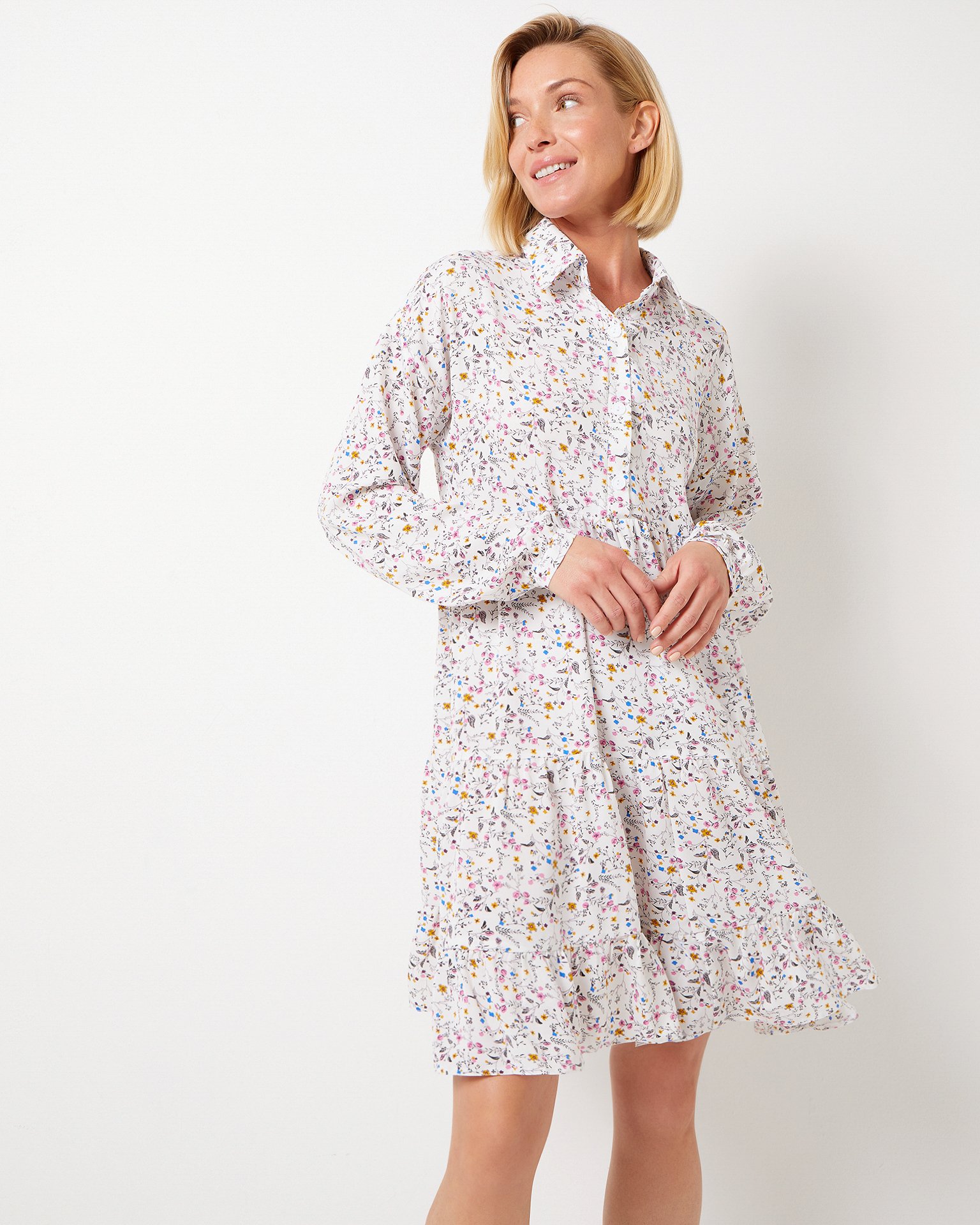 Платье с принтом, с длинными рукавами. Застежка на пуговицы на груди, рубашечный ворот, акцент на талии и юбка с воланом. Платья с цветочными принтами в этом сезоне возвращаются в гардероб всех модниц. Эту модель можно сочетать с объемными кардиганами или кожаной курткой, грубыми ботинками или элегантными босоножками, а можно дополнить необычными аксессуарами и создать образ в актуальном стиле бохо.