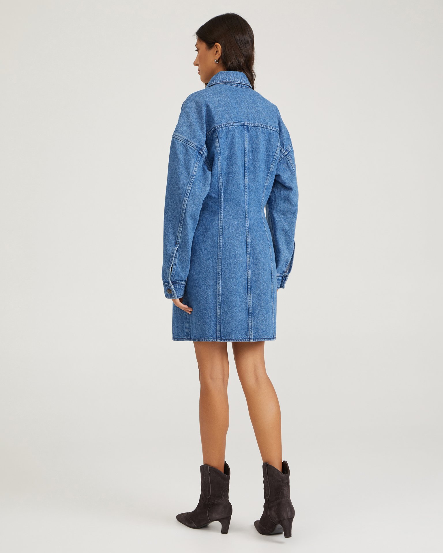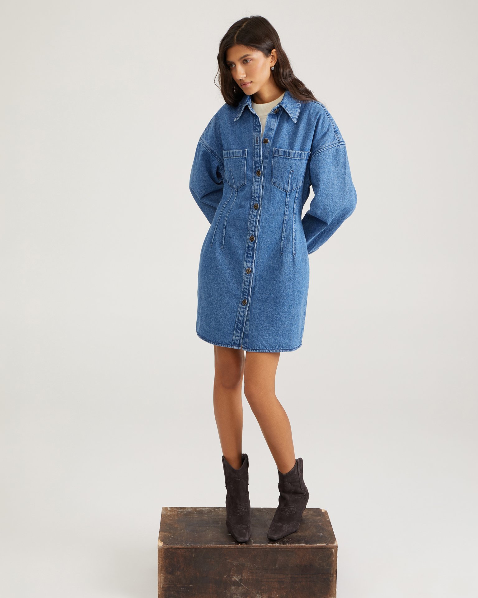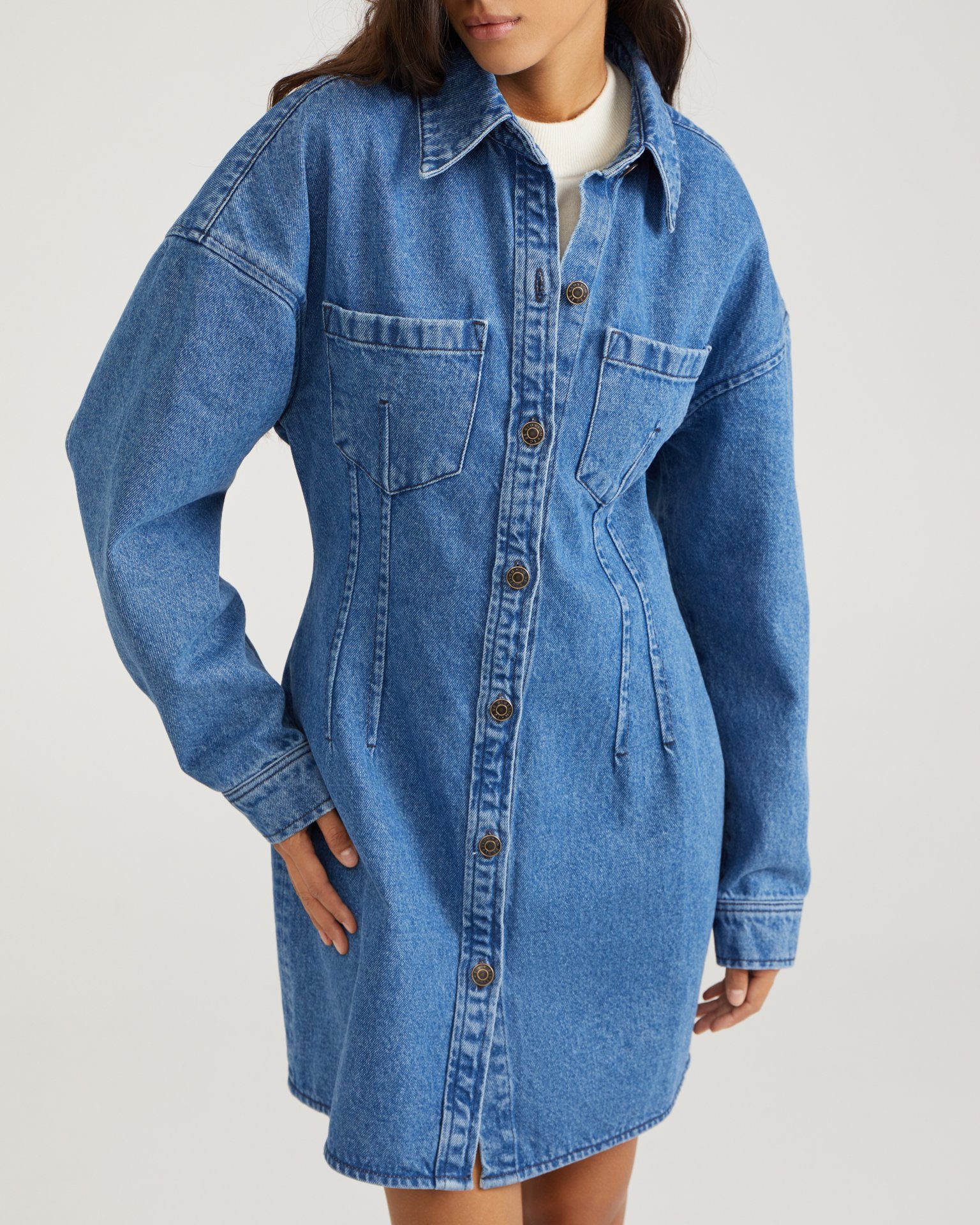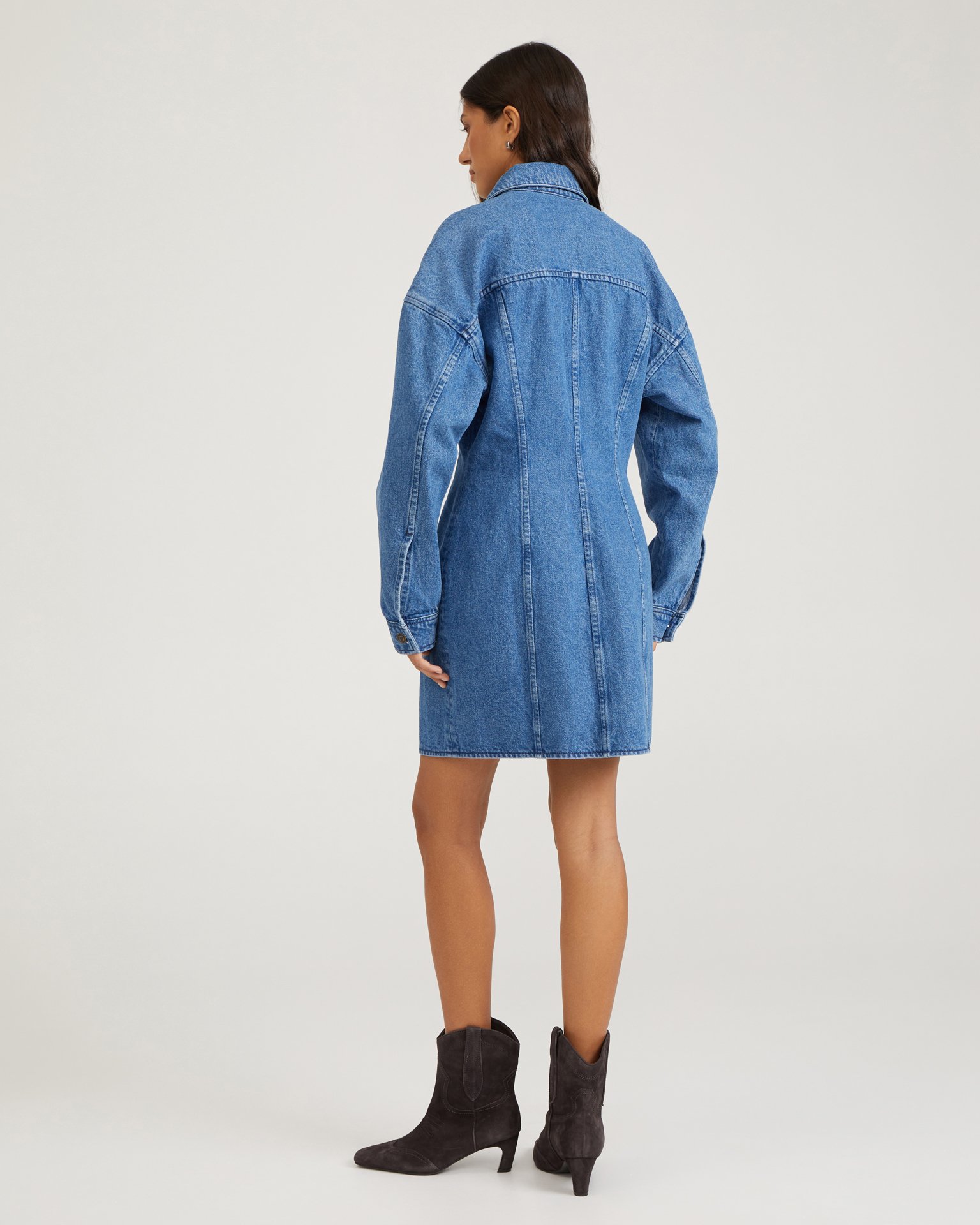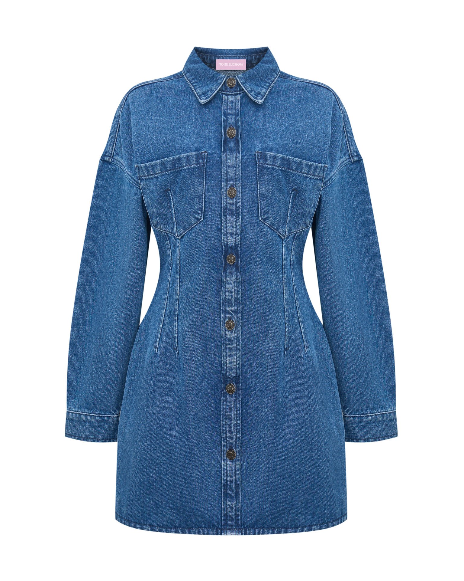 Платье мини выполнено из денима в голубом цвете. Модель дополнена отложным воротником, накладными карманами, объемными рукавами, рельефными швами и контрастной фурнитурой. Параметры модели: рост 175 см, грудь 86 см, талия 65 см, бедра 92 см. Размер на модели: S.