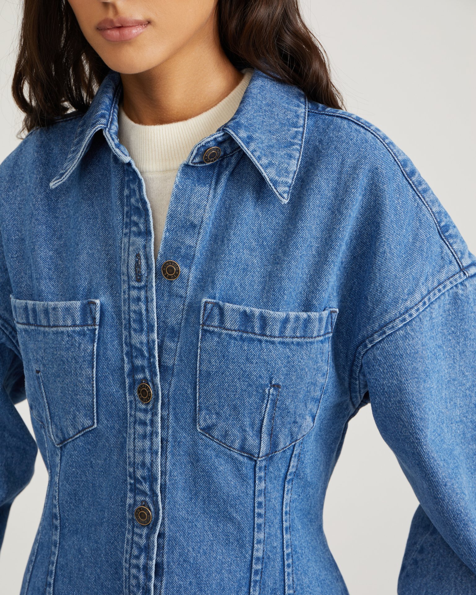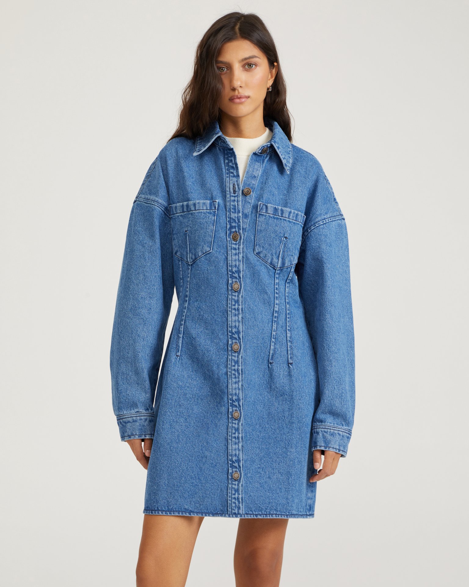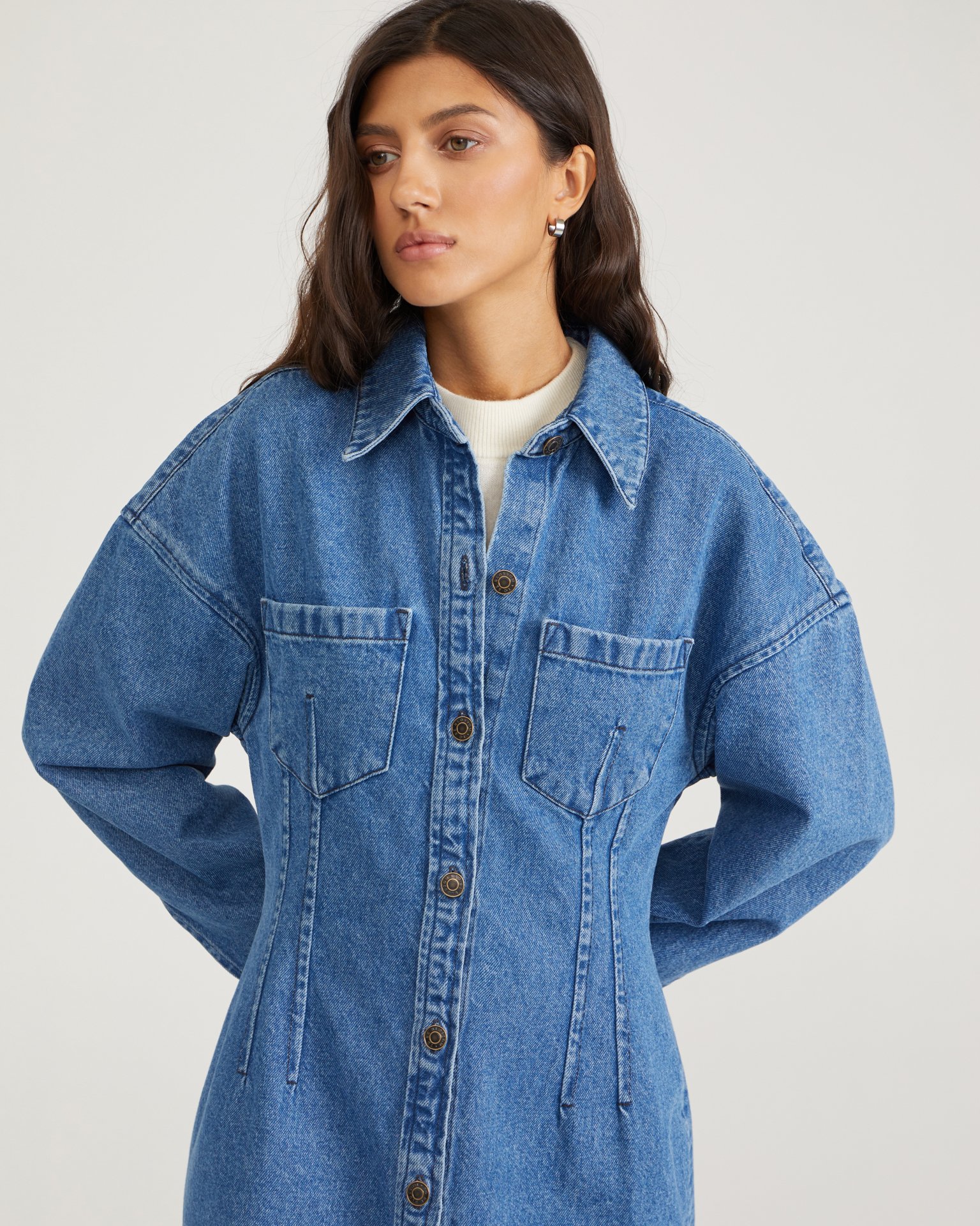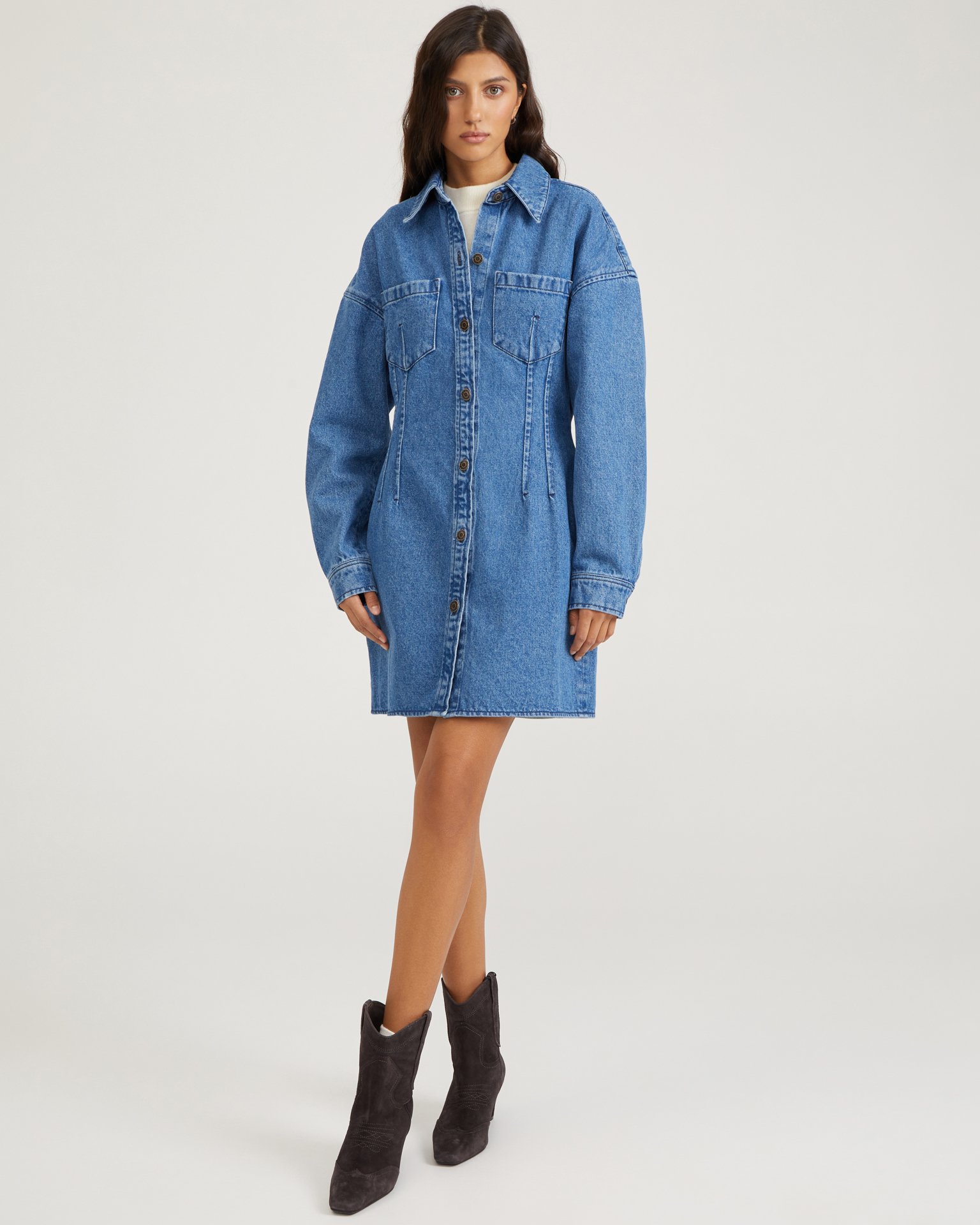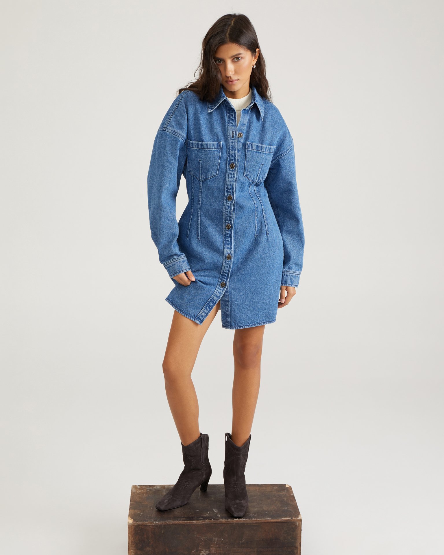 Платье мини выполнено из денима в голубом цвете. Модель дополнена отложным воротником, накладными карманами, объемными рукавами, рельефными швами и контрастной фурнитурой. Параметры модели: рост 175 см, грудь 86 см, талия 65 см, бедра 92 см. Размер на модели: S.