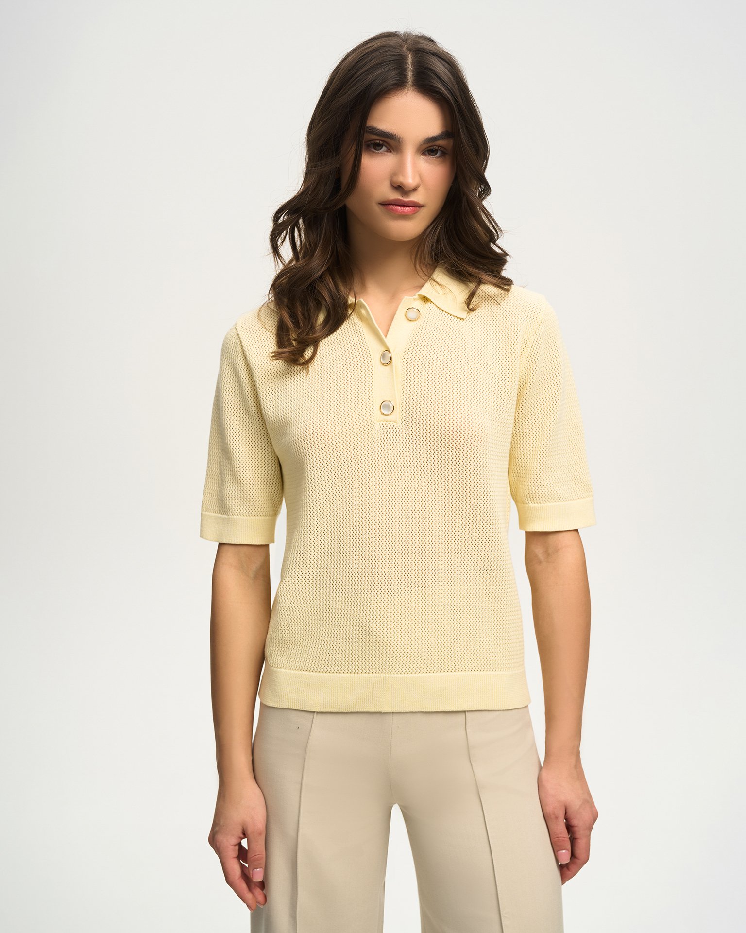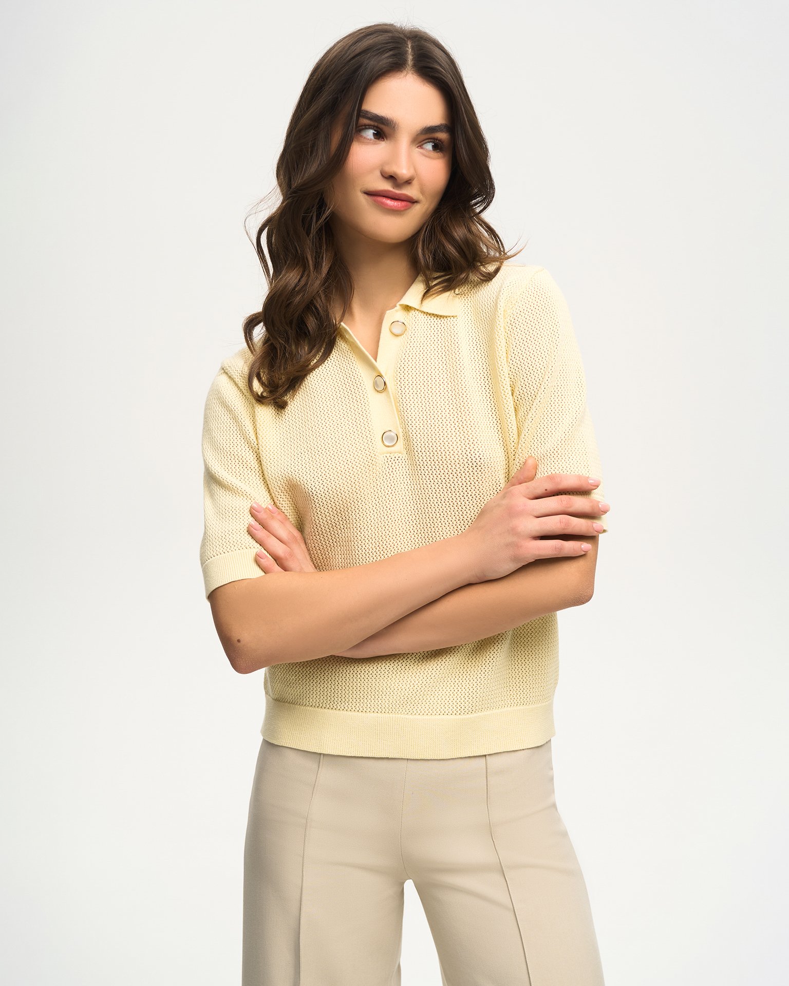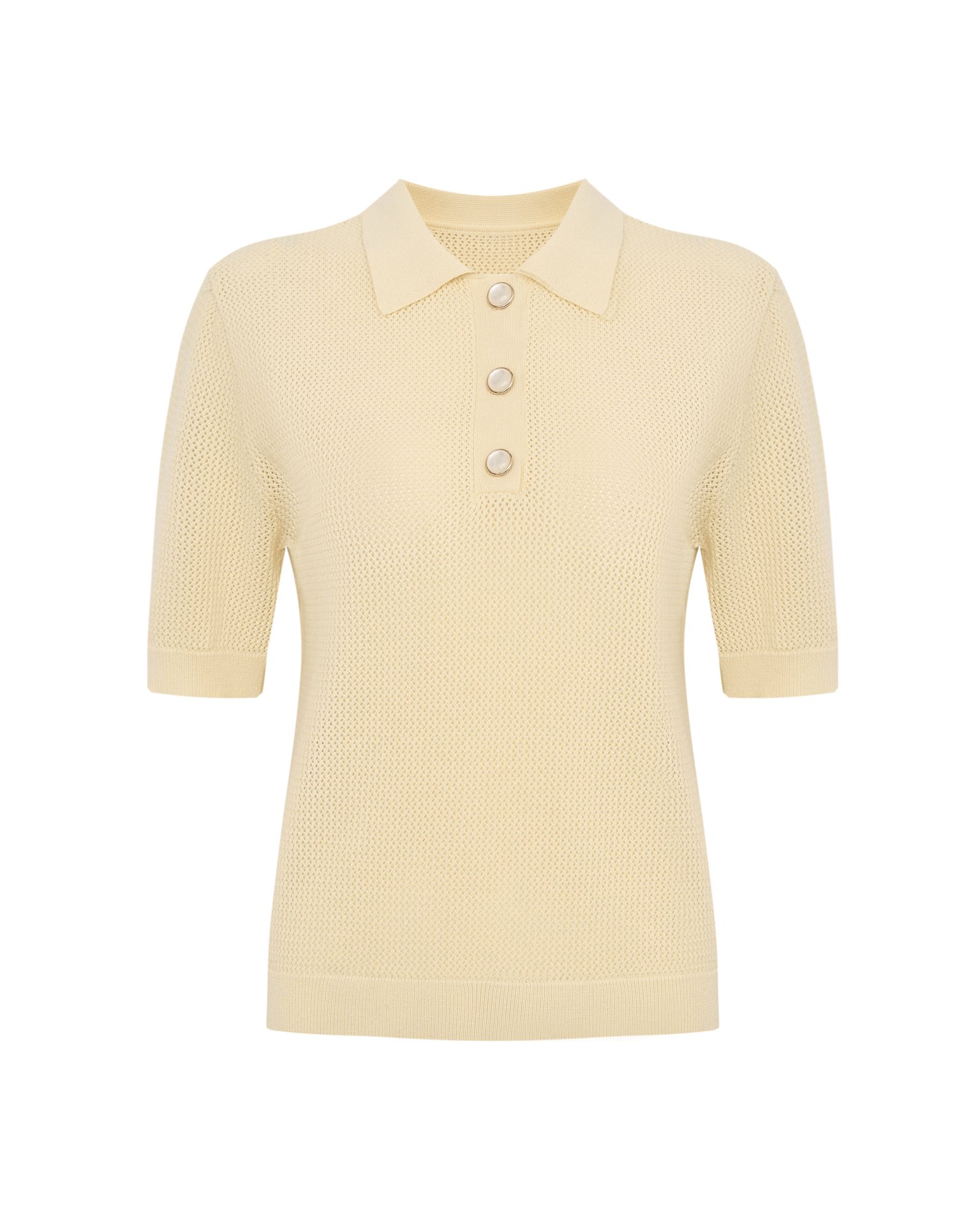 Ажурное поло из 100% хлопка в трендовом оттенке "сливочное масло" станет стильным акцентом вашего гардероба. Легкий трикотаж с нежным переплетением обеспечивает комфорт и создает утонченную текстуру, а жемчужные пуговицы придают образу изысканность. Плотные края по нижнему краю и манжетам гарантируют идеальную посадку и сохранение формы. Универсальная модель для создания женственных и актуальных образов. Параметры модели: рост 170 см, грудь 82 см, талия 63 см, бедра 93 см. Размер на модели: XS/S.