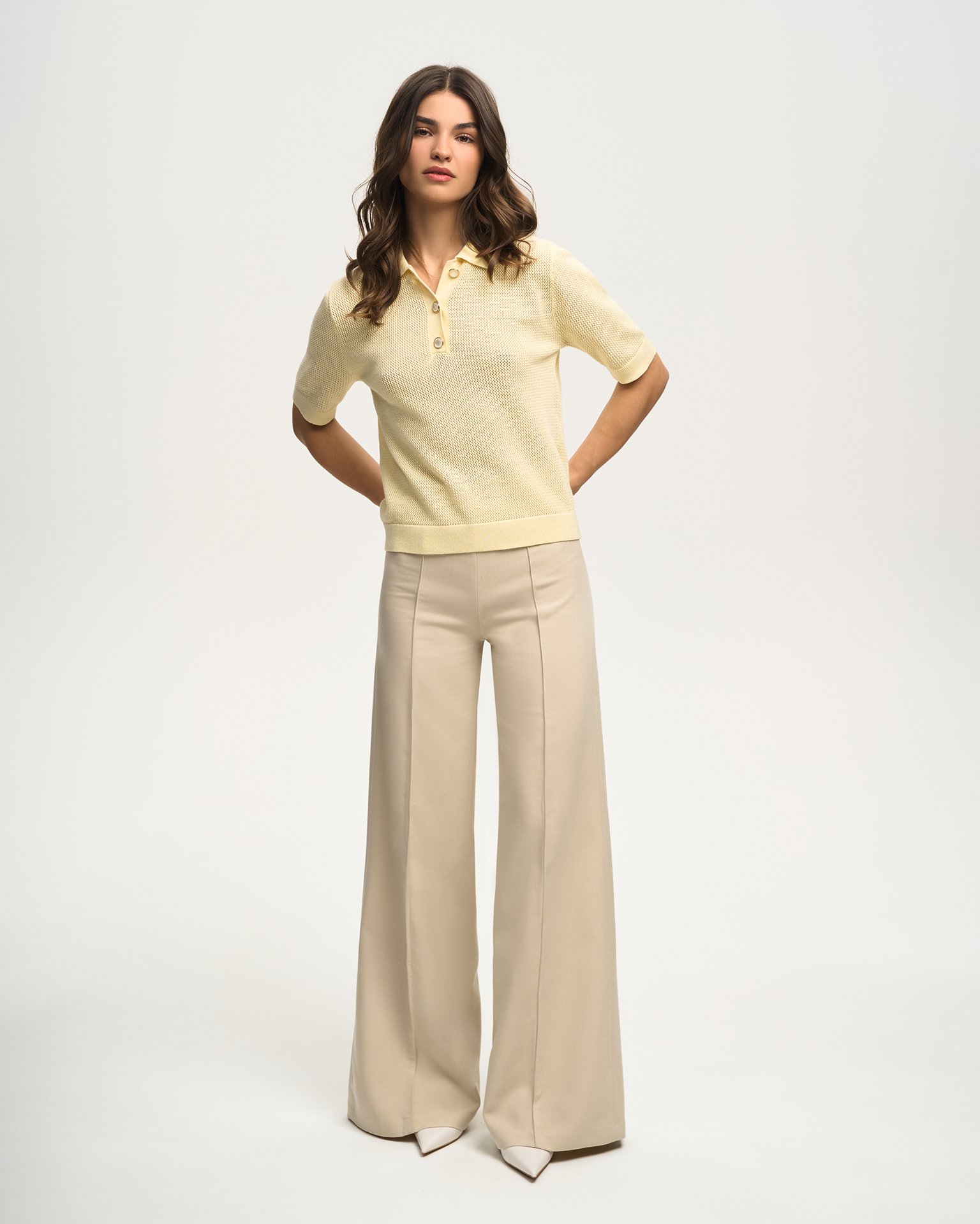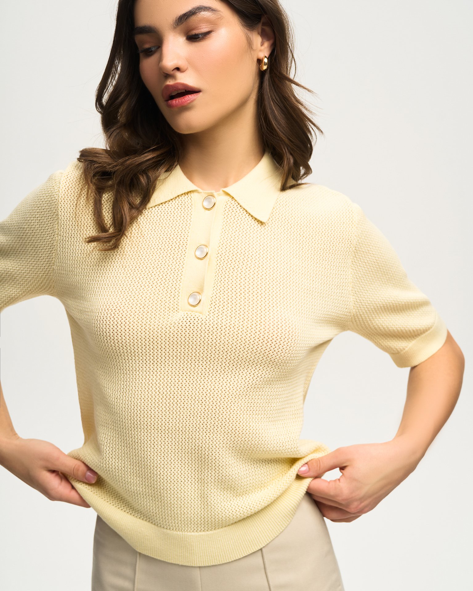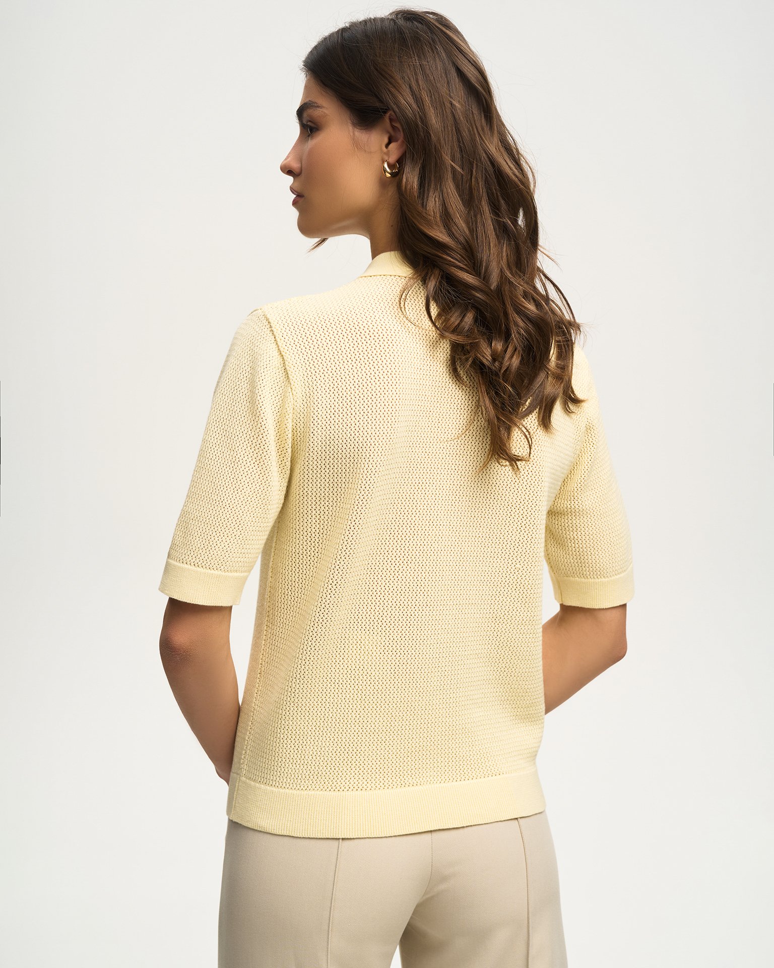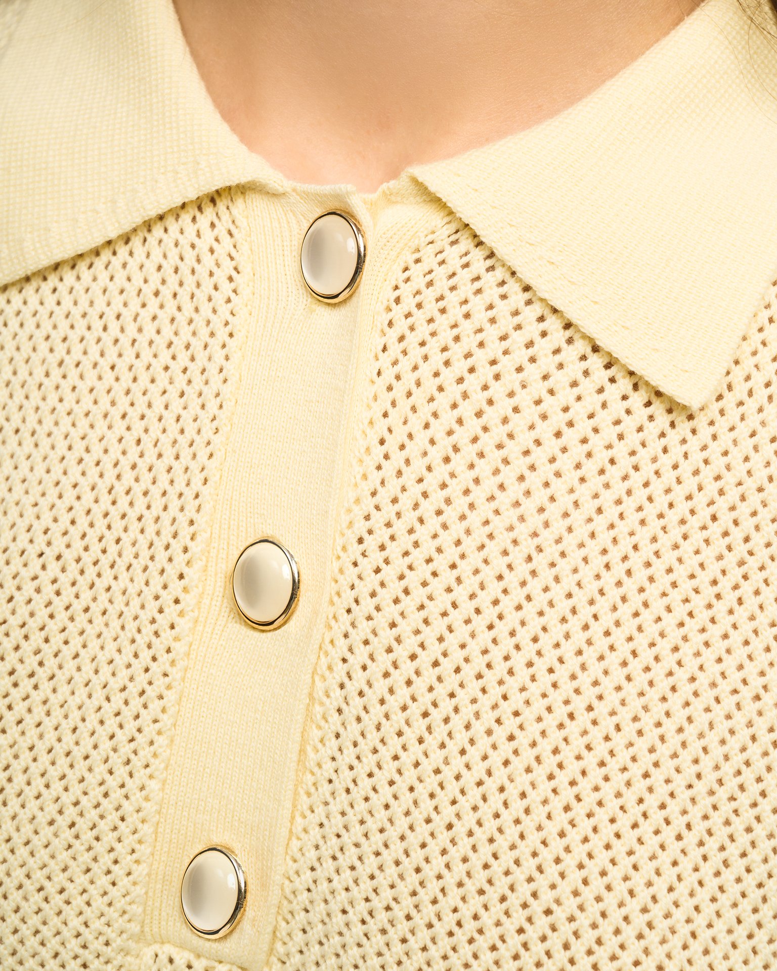 Ажурное поло из 100% хлопка в трендовом оттенке "сливочное масло" станет стильным акцентом вашего гардероба. Легкий трикотаж с нежным переплетением обеспечивает комфорт и создает утонченную текстуру, а жемчужные пуговицы придают образу изысканность. Плотные края по нижнему краю и манжетам гарантируют идеальную посадку и сохранение формы. Универсальная модель для создания женственных и актуальных образов. Параметры модели: рост 170 см, грудь 82 см, талия 63 см, бедра 93 см. Размер на модели: XS/S.