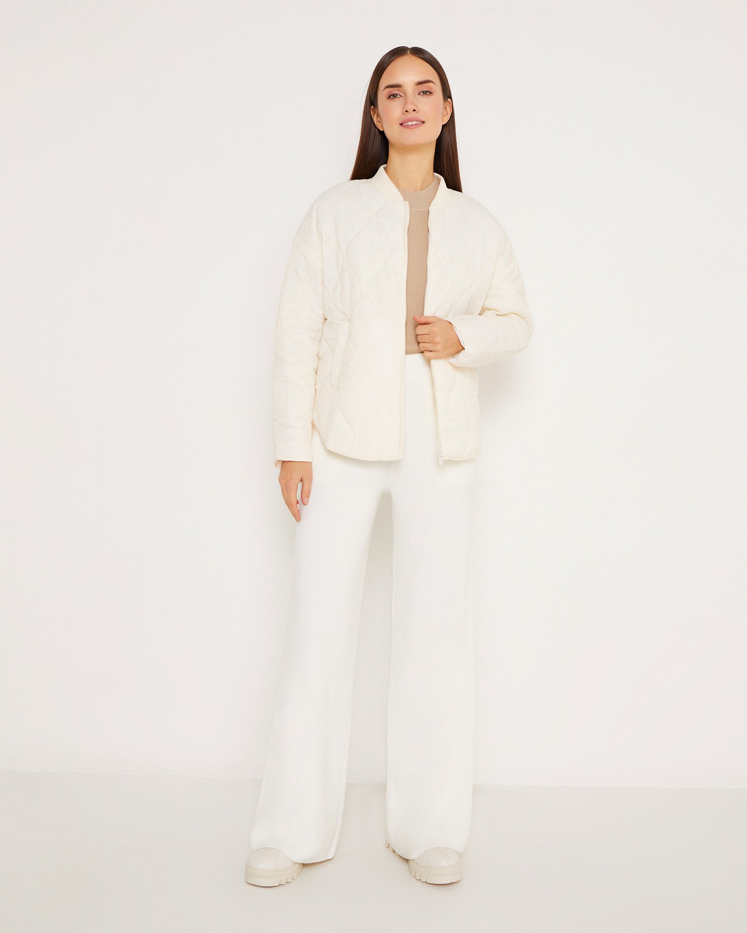 Стеганая куртка-бомбер с рукавами-реглан и прорезными карманами. Застежка на молнии.Эта модель заняла почетное место в гардеробе всех модниц и не сдает свои позиции уже несколько сезонов. Сочетать ее можно как со строгими офисными брюками и прямыми юбками, так и дополнить ей спортивный образ с леггинсами или джоггерами. Состав: 100% полиамид, подклад: 100% полиэстер Параметры модели: рост 170 см, грудь 79 см, талия 59 см, бедра 88 см