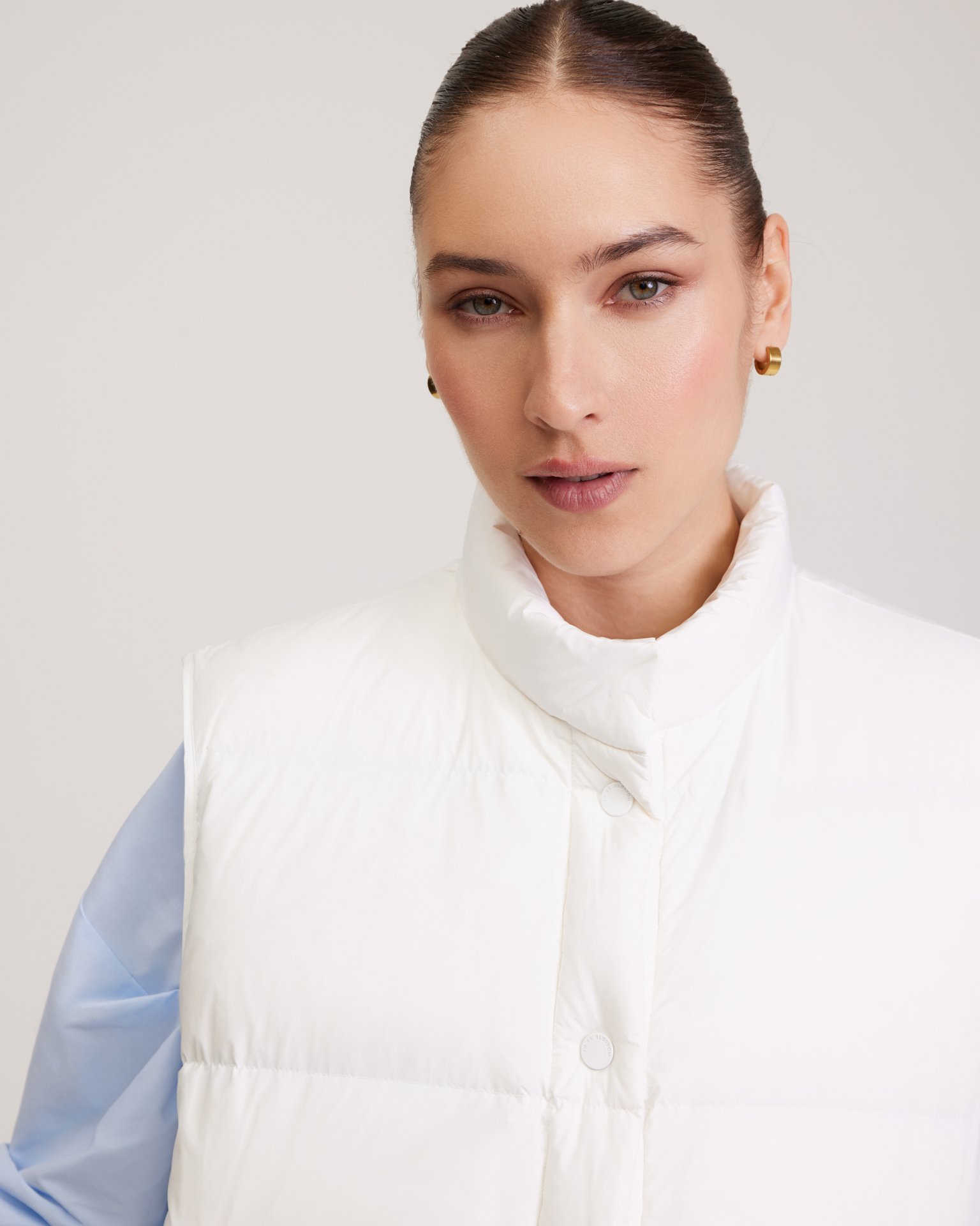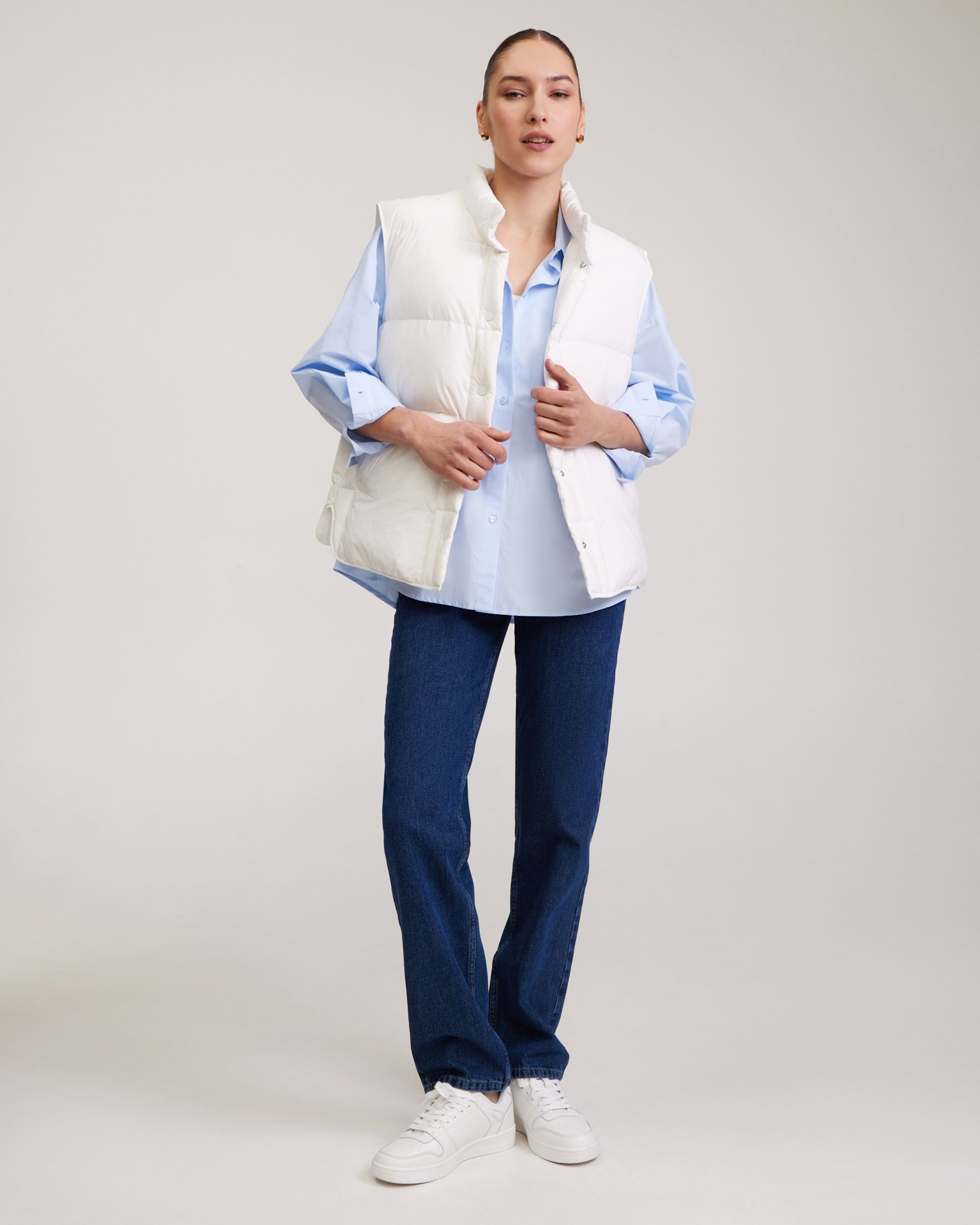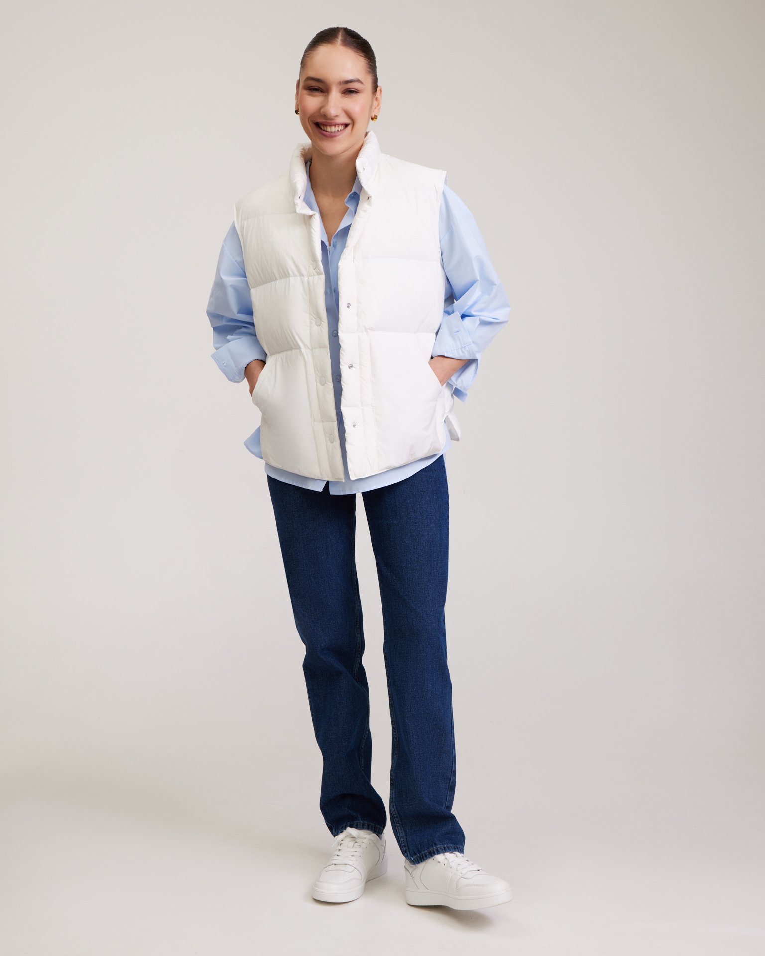 Жилет с натуральным пуховым наполнителем, небольшим воротником-стойкой и глубокими карманами и рядом клепок создан, чтобы сохранить тепло в прохладные дни и сформировать стильный многослойный образ. Параметры модели: рост 176 см, грудь 85 см, талия 63 см, бедра 94 см. Размер на модели: S.
