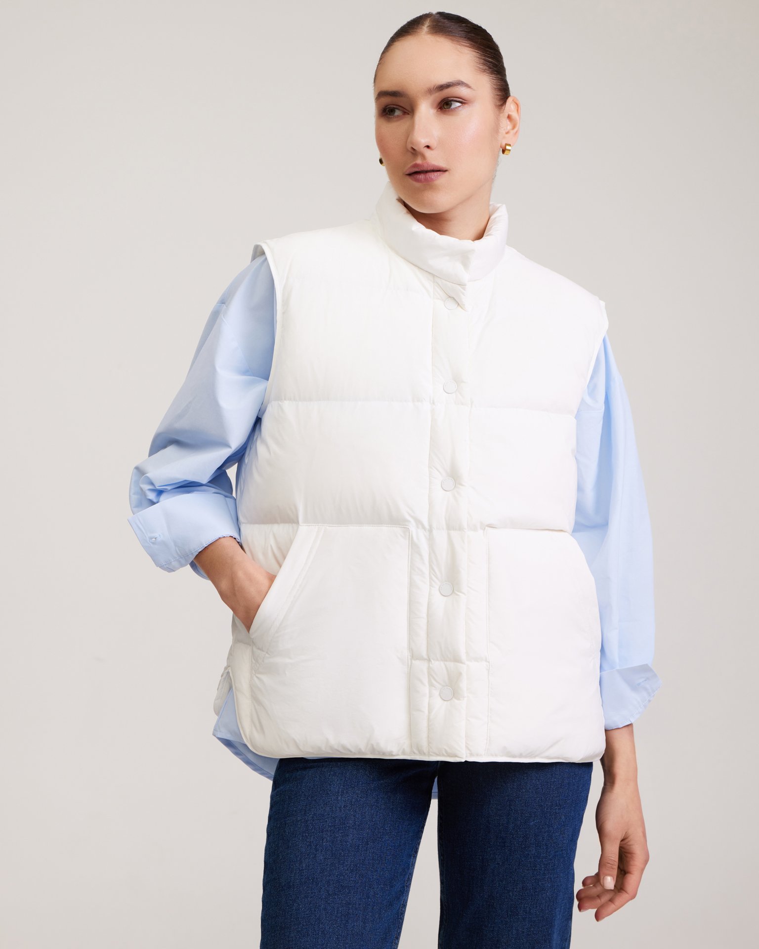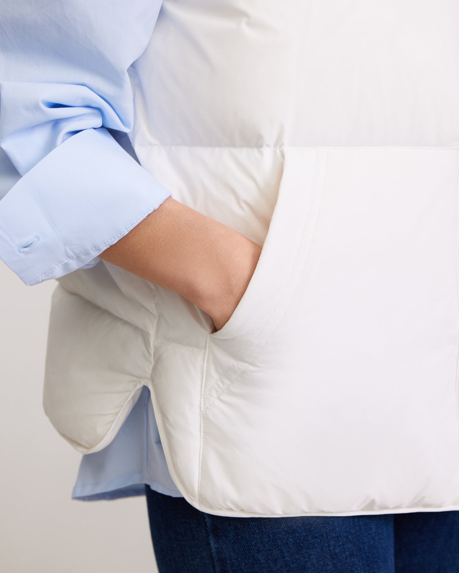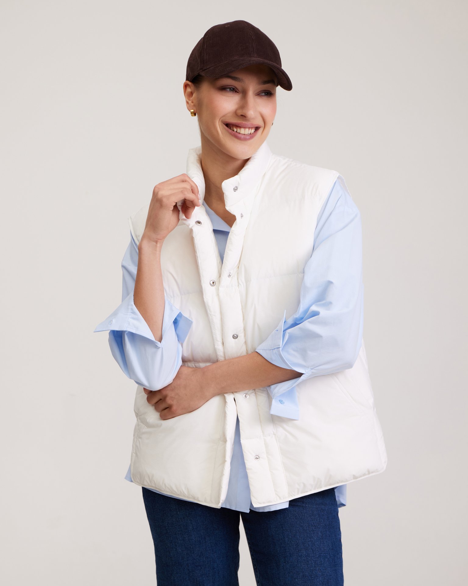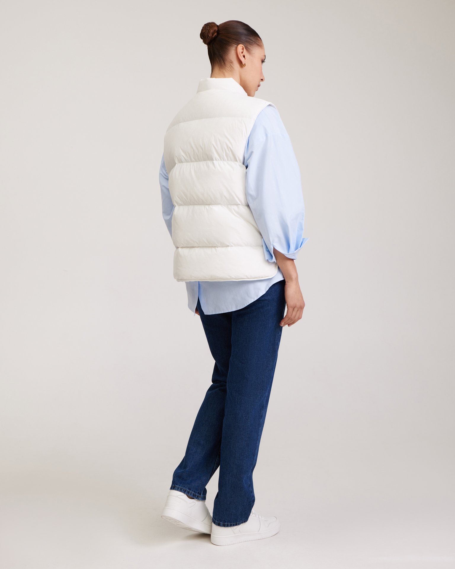 Жилет с натуральным пуховым наполнителем, небольшим воротником-стойкой и глубокими карманами и рядом клепок создан, чтобы сохранить тепло в прохладные дни и сформировать стильный многослойный образ. Параметры модели: рост 176 см, грудь 85 см, талия 63 см, бедра 94 см. Размер на модели: S.