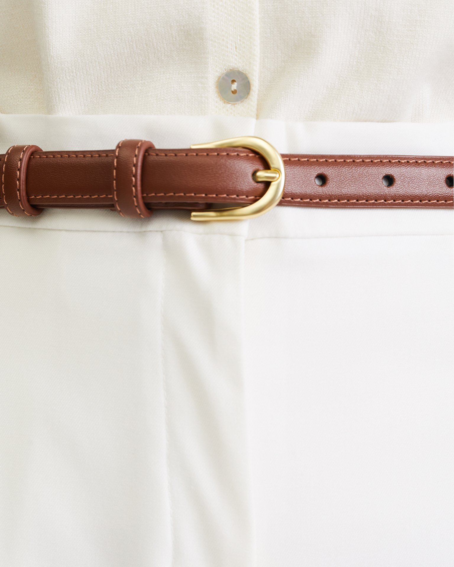 Аккуратный тонкий ремень с металлической фурнитурой в коричневом цвете.Элегантно подчеркнёт ваш повседневный или деловой образ. Состав: 100% натуральная кожа.