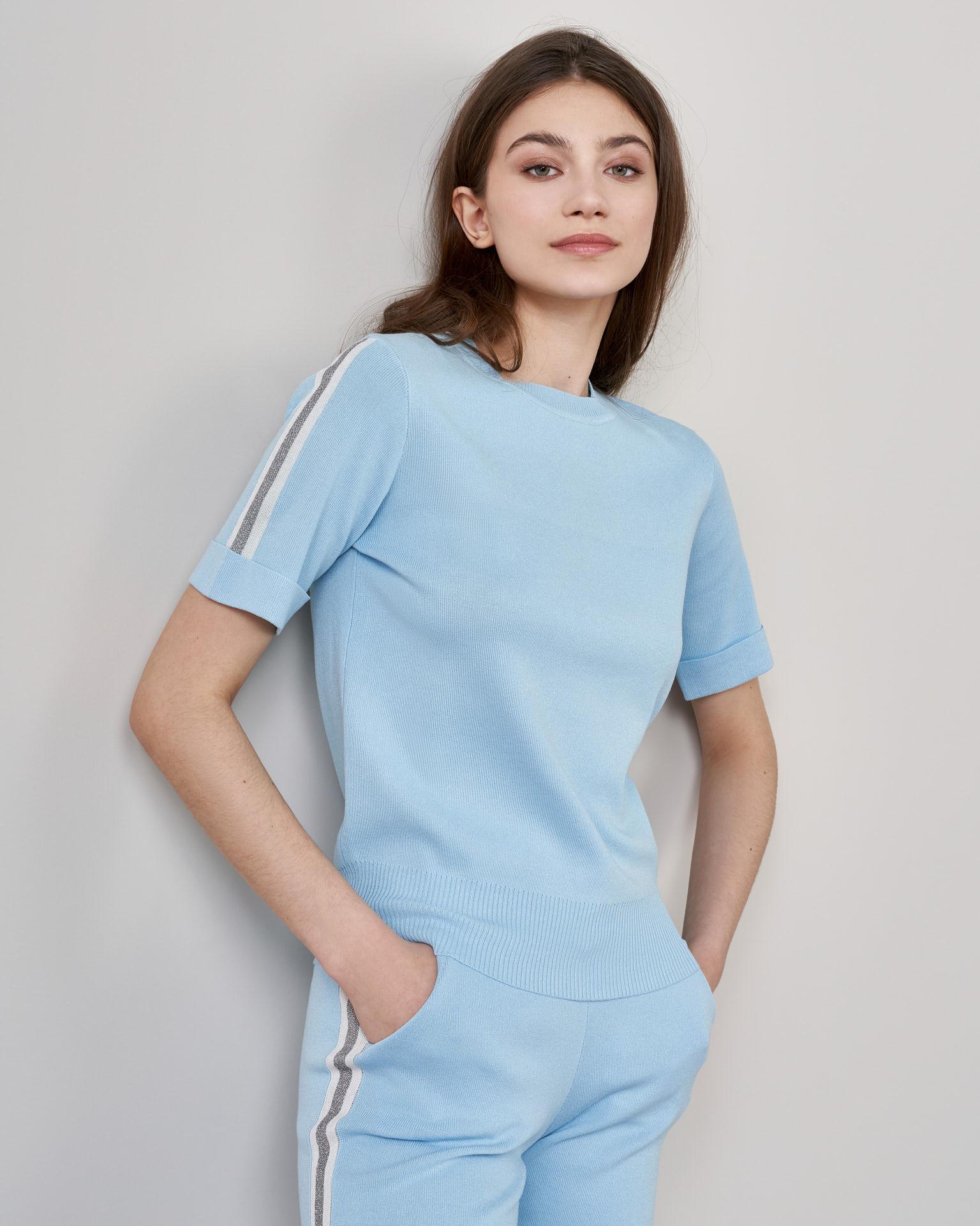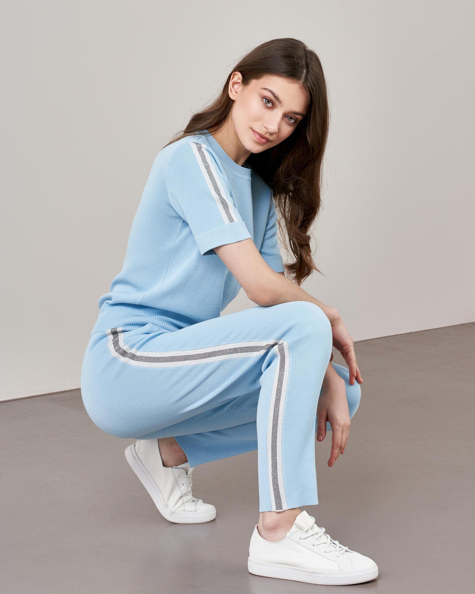 - Стильный костюм небесно-голубого оттенка для повседневных образов;- Модель состоит из брюк на эластичном притачном поясе и джемпера прямого кроя;- Особенностью комплекта стали лампасы, выполненные из мерцающей ткани.