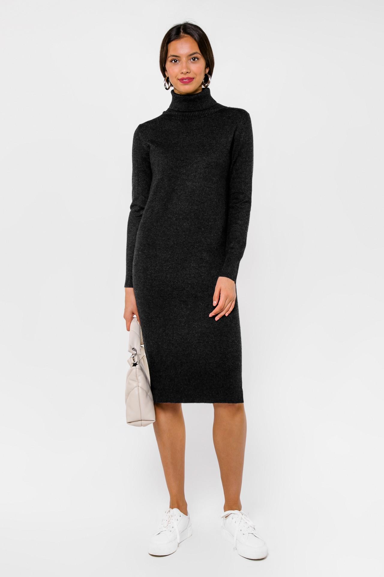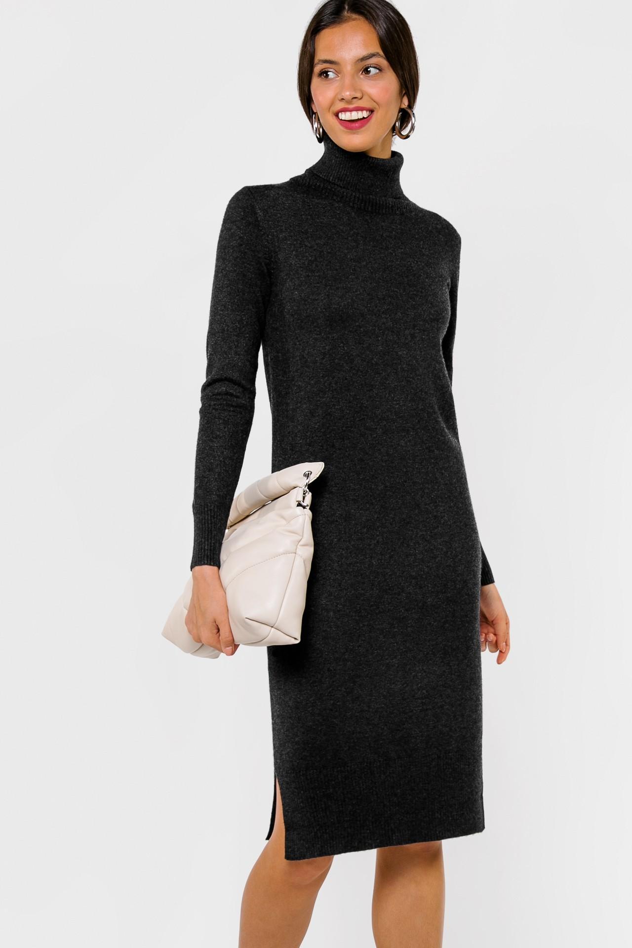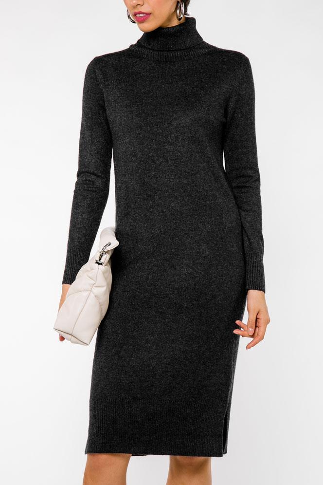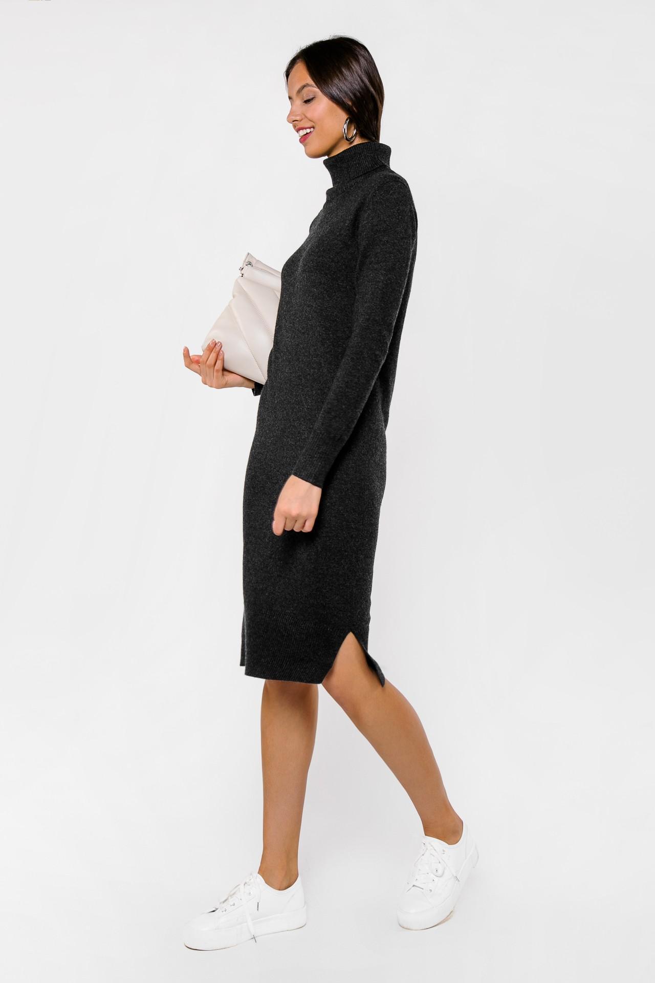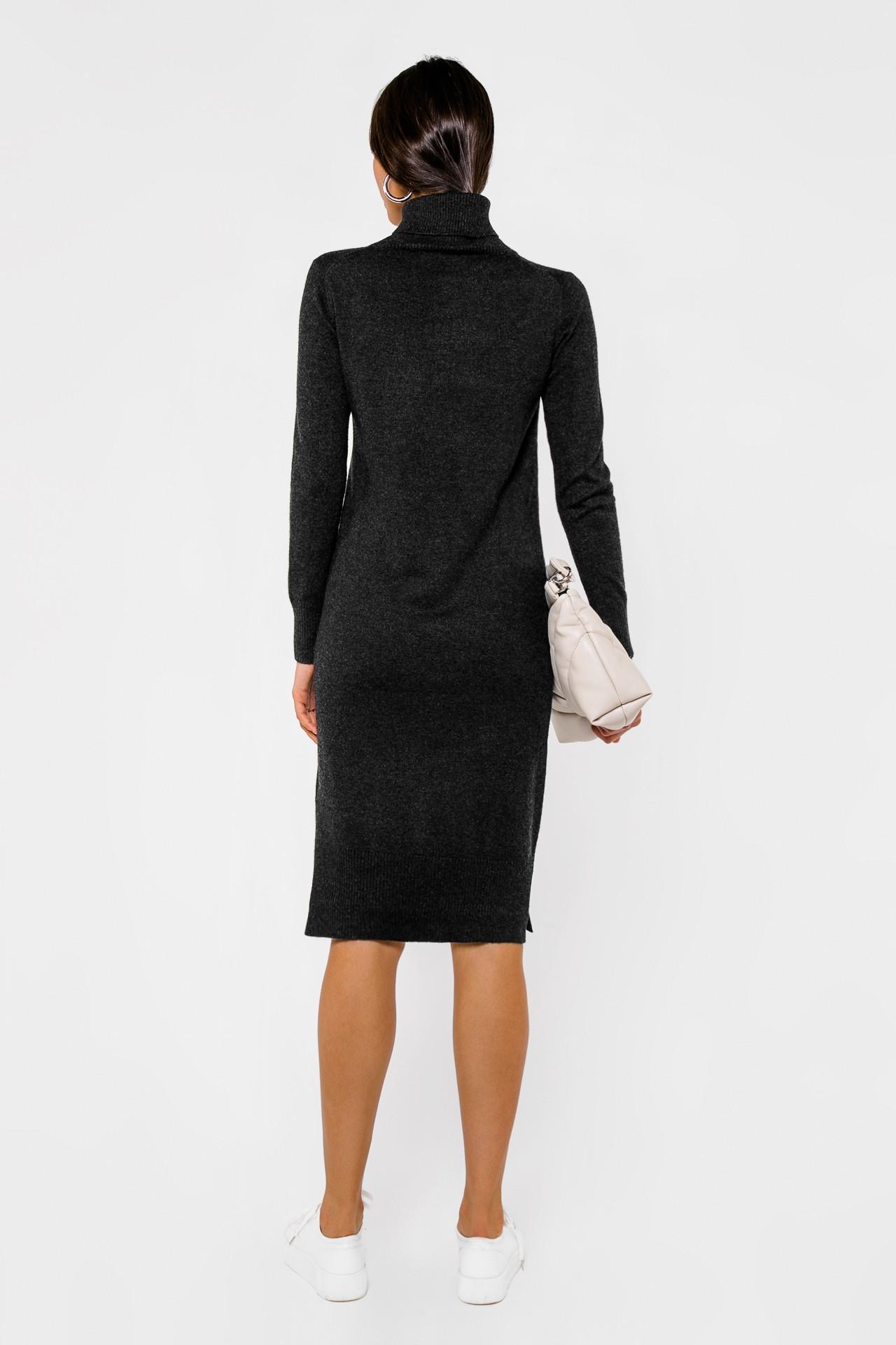 <span>- Лаконичное платье глубокого графитового оттенка;</span> - Состав: 45% кашемир, 30% шерсть, 25% вискоза; - Модель прямого силуэта идеально садится по фигуре и прекрасно держит форму; - Изделие с высоким воротником-гольфом и длинными втачными рукавами; - Платье дополнено двумя небольшими разрезами по бокам; - Параметры модели: рост 170 см, грудь 86 см, талия 63 см, бедра 89 см.