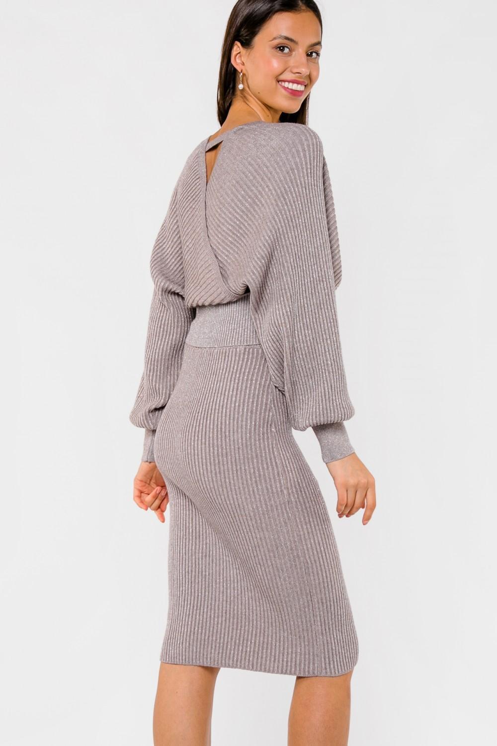 - Элегантный юбочный костюм нежного кофейного оттенка с вкраплениями нитей люрекса по всему полотну; - Состав: 50% шерсть, 30% вискоза , 10% акрил, 10% полиэстер; - Юбка облегающего силуэта на эластичном притачном поясе, джемпер свободного кроя с глубоким V-образным вырезом горловины, переходящим на спинку, и длинными объемными рукавами "Летучая мышь"; - Комплект можно носить по отдельности, сочетая с другими элементами гардероба; - <span>Параметры модели: рост 170 см, грудь 84 см, талия 61 см, бедра 90 см.</span>